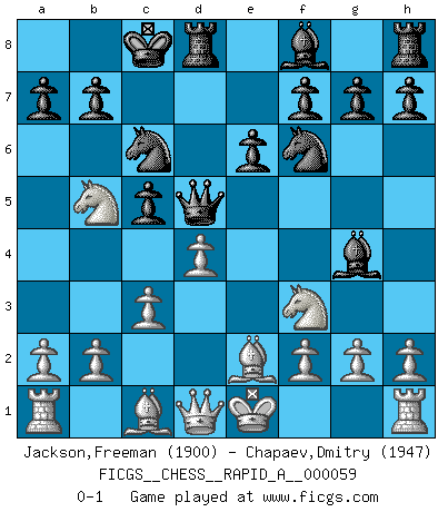 Last move : 0-1 2009 March 14 22:47:18 [Event "FICGS__CHESS__RAPID_A__000059"] [Site "FICGS"] [Date "2009.01.24"] [Round "1"] [White "Jackson,Freeman"] [Black "Chapaev,Dmitry"] [Result "0-1"] [WhiteElo "1900"] [BlackElo "1947"] 1.e4 c5 2.c3 d5 3.exd5 Qxd5 4.d4 Nf6 5.Nf3 Bg4 6.Be2 e6 7.Na3 Nc6 8.Nb5 O-O-O 0-1 This chess game has been lost on time (started : 2009.01.24 15:41:42) Sicilian : Alapin's variation (2.c3) Queenside Castling by player Black (move 8) Player Black won this chess game. Follow this game move after move (download)There must have been a time when men were demigods, or they could not have invented Chess. (Gustav Schenk) Habe Mut, dich deines eigenen Verstandes zu bedienen. (Immanuel Kant) Coloca el contenido de las piezas del Ajedrez en un sombrero, agitalo vigorosamente, arrojalas en un tablero desde una altura de 30 centimetros y así obtendras el estilo de Steinitz. (H. E. Bird) Que feriez-vous si vous étiez en train de jouer aux échecs et que la fin du monde arrive ? Je continuerais à jouer. (Saint Borromée) Indecision is the key to flexibility. (Unknown)