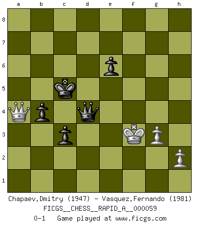 Last move : 0-1 2009 June 25 8:47:28 [Event "FICGS__CHESS__RAPID_A__000059"] [Site "FICGS"] [Date "2009.01.24"] [Round "1"] [White "Chapaev,Dmitry"] [Black "Vasquez,Fernando"] [Result "0-1"] [WhiteElo "1947"] [BlackElo "1981"] 1.d4 d5 2.c4 dxc4 3.Nf3 Nf6 4.Nc3 a6 5.e4 b5 6.e5 Nd5 7.a4 Nxc3 8.bxc3 Bb7 9.e6 fxe6 10.Be2 g6 11.Bf4 Qd5 12.Be5 Rg8 13.Bxc7 Nc6 14.O-O Bg7 15.axb5 axb5 16.Rxa8+ Bxa8 17.Qc1 e5 18.dxe5 Nxe5 19.Bxe5 Bxe5 20.Rd1 Qc6 21.Bf1 Qc5 22.Nxe5 Qxe5 23.Rd4 Rf8 24.Qd2 Bc6 25.g3 Rf6 26.Rd8+ Kf7 27.Qh6 Qe1 28.Rd2 Qe4 29.f3 Rxf3 30.Qxh7+ Ke8 31.Re2 Rxf1+ 32.Kxf1 Qh1+ 33.Kf2 Qf3+ 34.Ke1 Qxc3+ 35.Kf2 Qf6+ 36.Ke1 Bd5 37.Qh4 Qa1+ 38.Kf2 Qa7+ 39.Re3 Qc5 40.Ke2 b4 41.Re5 e6 42.Qg5 Kd7 43.Qxg6 Bf3+ 44.Kxf3 Qxe5 45.Qf7+ Kc6 46.Qe8+ Kc5 47.Qa4 Qd5+ 48.Ke3 Qd4+ 49.Kf3 c3 0-1 This chess game has been lost on time (started : 2009.01.24 15:41:42) QGA, Bogolyubov variation Kingside Castling by player White (move 14) 10 pieces endgame at move 44 : White KQRPP , Black KQPPP WHITE : King + 1 Queen 1 Rook 2 Pawns BLACK : King + 1 Queen 3 Pawns 9 pieces endgame at move 44 : White KQPP , Black KQPPP WHITE : King + 1 Queen 2 Pawns BLACK : King + 1 Queen 3 Pawns Player Black won this chess game. Follow this game move after move (download)It was clear to me that the vulnerable point of the American Grandmaster (Bobby Fischer) was in double-edged, hanging, irrational positions, where he often failed to find a win even in a won position. (Efim Geller) Kritik überlasse ich den Spießern. Ich zeige nichts, wofür ich mich schämen muss. (Alexandra Kosteniuk) El pensamiento metódico es mas útil en el Ajedrez que la inspiración. (C. J. S. Purdy) Aux échecs, les retours au sommet sont rares : les dommages psychologiques consécutifs à une défaite sont trop sévères. (Daily Telegraph) Every man's memory is his private literature. (Aldous Huxley)