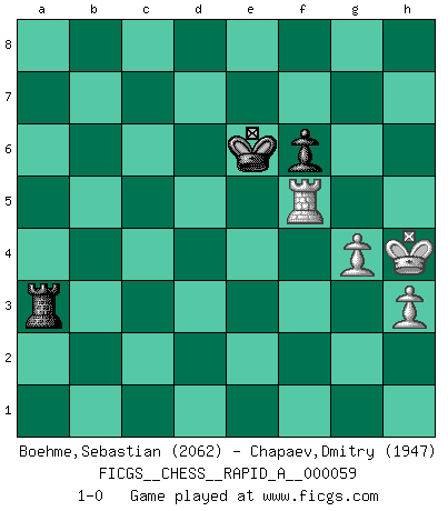 Last move : 1-0 2009 July 21 23:11:22 [Event "FICGS__CHESS__RAPID_A__000059"] [Site "FICGS"] [Date "2009.01.24"] [Round "1"] [White "Boehme,Sebastian"] [Black "Chapaev,Dmitry"] [Result "1-0"] [WhiteElo "2062"] [BlackElo "1947"] 1.e4 c5 2.Nf3 Nc6 3.d4 cxd4 4.Nxd4 Nf6 5.Nc3 e5 6.Ndb5 d6 7.Bg5 a6 8.Na3 b5 9.Bxf6 gxf6 10.Nd5 f5 11.Bd3 Be6 12.O-O Bxd5 13.exd5 Ne7 14.Re1 Bg7 15.c3 O-O 16.Nc2 Re8 17.a4 e4 18.Bf1 bxa4 19.Ne3 Rb8 20.Re2 a5 21.Rxa4 Bh6 22.g3 Qc7 23.Qd4 Rb5 24.Rd2 Rb3 25.Rc2 Reb8 26.Ra2 Bxe3 27.Qxe3 Nxd5 28.Qg5+ Kf8 29.Rd2 Ne7 30.Qf6 Qc5 31.Rxd6 e3 32.Kg2 exf2 33.Ra4 Ng8 34.Rd8+ Rxd8 35.Qxd8+ Kg7 36.Rxa5 Qc6+ 37.Qd5 Qxd5+ 38.Rxd5 Rxb2 39.Rxf5 Nf6 40.c4 Rc2 41.Rxf2 Rc3 42.Be2 Nd7 43.Rf4 f6 44.Rg4+ Kf7 45.Rd4 Ne5 46.Kf2 Ra3 47.Ke1 h6 48.Kd2 Ra2+ 49.Ke3 Rc2 50.Re4 Ra2 51.Rh4 Kg6 52.Rf4 Kf7 53.Re4 Ke6 54.Kd4 Kd6 55.h3 Rd2+ 56.Ke3 Rc2 57.Rh4 Rc3+ 58.Kf2 Nf7 59.Bf3 Ke5 60.Bd5 Nd6 61.g4 Nxc4 62.Bxc4 Rxc4 63.Rxh6 Rc2+ 64.Kg3 Rc3+ 65.Kh4 Rf3 66.Rh8 Ke6 67.Rh5 Ra3 68.Rf5 1-0 This chess game has been lost on time (started : 2009.01.24 15:41:42) Sicilian : Pelikan (Lasker/Sveshnikov) variation Kingside Castling by player White (move 12) Kingside Castling by player Black (move 15) 10 pieces endgame at move 61 : White KRBPP , Black KRNPP WHITE : King + 1 Rook 1 Bishop 2 Pawns BLACK : King + 1 Rook 1 Knight 2 Pawns 9 pieces endgame at move 62 : White KRBPP , Black KRPP WHITE : King + 1 Rook 1 Bishop 2 Pawns BLACK : King + 1 Rook 2 Pawns 8 pieces endgame at move 62 : White KRPP , Black KRPP WHITE : King + 1 Rook 2 Pawns BLACK : King + 1 Rook 2 Pawns 7 pieces endgame at move 63 : White KRPP , Black KRP WHITE : King + 1 Rook 2 Pawns BLACK : King + 1 Rook 1 Pawn Player White won this chess game. Follow this game move after move (download)I prefer to lose a really good game than to win a bad one. (David Levy) Schach ist Krieg, im Schach geht es um testosterongesteuerte Urschreie. (Garry Kasparov) Yo he agregado estos principios a la ley: pongan los Caballos en acción antes de que los dos Alfiles sean desarrollados. (Emanuel Lasker) Il a essayé de se convaincre qu'il pourrait empêcher toutes les erreurs et ne jamais perdre. L'horreur ! Gary Kasparov au sujet de Robert Fischer. If we don't succeed, we run the risk of failure. (George W. Bush)