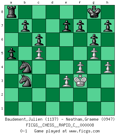 Last move : 0-1 2006 October 22 18:43:13 [Event "FICGS__CHESS__RAPID_C__000008"] [Site "FICGS"] [Date "2006.08.24"] [Round "1"] [White "Baudement,Julien"] [Black "Neatham,Graeme"] [Result "0-1"] [WhiteElo "1137"] [BlackElo "0947"] 1.Nf3 d5 2.d4 Nf6 3.c4 g6 4.Nc3 Bg7 5.e3 O-O 6.b4 Bf5 7.Bd3 Ne4 8.O-O Nxc3 9.Qc2 Ne4 10.cxd5 Qxd5 11.Bc4 Nd6 12.Bxd5 Bxc2 13.Bb2 Be4 14.Bb3 Nc6 15.Ng5 Bd3 16.Rfd1 Bc4 17.Rac1 Bxb3 18.axb3 Nb5 19.Ne4 Nxb4 20.Rc5 c6 21.f4 Rfd8 22.g4 Rd5 23.Nc3 Rxc5 24.dxc5 Bxc3 25.Bxc3 Nxc3 26.Rd4 Ne2+ 27.Kf2 Nxd4 28.Kg3 Ne2+ 29.Kf3 Nc1 30.h4 Nxb3 31.g5 a5 0-1 Reti Opening Kingside Castling by player Black (move 5) Kingside Castling by player White (move 8) Player Black won this chess game. Follow this game move after move (download)I have never in my life played the French Defence, which is the dullest of all openings. (Wilhelm Steinitz) Spiel ein langweiliges Spiel zu Ende und lustige Dinge können passieren. (Hans Ree) Una mala movida nulifica cuarenta buenas. (Horowitz) Les échecs, c'est l'art d'analyser. (Mikhail Botvinnik) There are lots of people who mistake their imagination for their memory. (Josh Bilings)