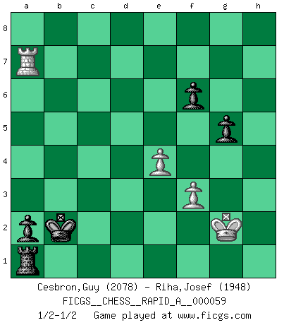 Last move : 1/2-1/2 2009 May 27 0:39:32 [Event "FICGS__CHESS__RAPID_A__000059"] [Site "FICGS"] [Date "2009.01.24"] [Round "1"] [White "Cesbron,Guy"] [Black "Riha,Josef"] [Result "1/2-1/2"] [WhiteElo "2078"] [BlackElo "1948"] 1.e4 c5 2.Nf3 e6 3.c3 d5 4.e5 d4 5.Bd3 Nc6 6.O-O Nge7 7.Be4 Bd7 8.Na3 Ng6 9.Nc4 b5 10.Nd6+ Bxd6 11.exd6 O-O 12.cxd4 cxd4 13.Re1 Be8 14.d3 Qxd6 15.Bxg6 hxg6 16.Ng5 Bd7 17.Qf3 f6 18.Ne4 Qc7 19.Bf4 e5 20.Bd2 Rac8 21.Rec1 Be6 22.b4 Qd7 23.Nc5 Qf7 24.Nxe6 Qxe6 25.a4 Ne7 26.axb5 Rxc1+ 27.Rxc1 Rc8 28.Ra1 Rc2 29.Be1 Ra2 30.Rc1 Qd5 31.Qg4 Kf7 32.h4 Qxb5 33.h5 g5 34.h6 gxh6 35.Qh5+ Ke6 36.Qh3+ Nf5 37.Qf3 Ra6 38.Kh2 Qd7 39.Qh5 Qf7 40.Qg4 h5 41.Qd1 Nd6 42.b5 Rb6 43.Bb4 Rxb5 44.Bxd6 Kxd6 45.Rc8 Qd7 46.Qc2 Rb7 47.Rf8 Ke6 48.Rh8 h4 49.Qe2 Qg7 50.Rg8 Qe7 51.Qg4+ Kd5 52.Qe2 Kd6 53.Qa2 e4 54.dxe4 Qe5+ 55.Kg1 a5 56.Qa3+ Rb4 57.Qc1 Rb5 58.Qc2 Qc5 59.Qd1 Rb2 60.Rd8+ Ke7 61.Rxd4 Rc2 62.Rd7+ Ke6 63.Rd6+ Kf7 64.Qd5+ Qxd5 65.Rxd5 a4 66.Ra5 Ra2 67.f3 a3 68.Kh2 Ra1 69.g3 hxg3+ 70.Kxg3 a2 71.Kg2 Ke6 72.Ra6+ Ke5 73.Ra5+ Kd4 74.Ra4+ Kd3 75.Ra8 Kc3 76.Ra7 Kb2 1/2-1/2 Sicilian defense Kingside Castling by player White (move 6) Kingside Castling by player Black (move 11) 10 pieces endgame at move 69 : White KRPP , Black KRPPPP WHITE : King + 1 Rook 2 Pawns BLACK : King + 1 Rook 4 Pawns 9 pieces endgame at move 70 : White KRPP , Black KRPPP WHITE : King + 1 Rook 2 Pawns BLACK : King + 1 Rook 3 Pawns This chess game ended in a draw. Follow this game move after move (download)I still hope to kill Fischer. (Boris Spassky) Schach ist gnadenlos. Du mußt bereit sein zu töten. (Nigel Short) La captura del Rey enemigo es la finalidad pero no el primer objetivo de la partida. (William Steinitz) Botvinnik disait en comparant les échecs à la musique: Il existe une science dont le but est l'étude de l'acoustique et des sons. Mais il y a aussi un art qui se sert de l'océan des sons : c'est la musique. De toute évidence, il en est de même pour la pensée. La logique est l'étude des lois de la réflexion et les échecs reflètent, en tant qu'art, le côté logique de la réflexion, sous la forme d'images artistiques... Extrait de Fischer - Spassky, Reykjavik 1972 par Alexander & F. Wyndham (Ed. Solar), p 37. Unless in communicating with it one says exactly what one means, trouble is bound to result. (Alan Turing, about computers)