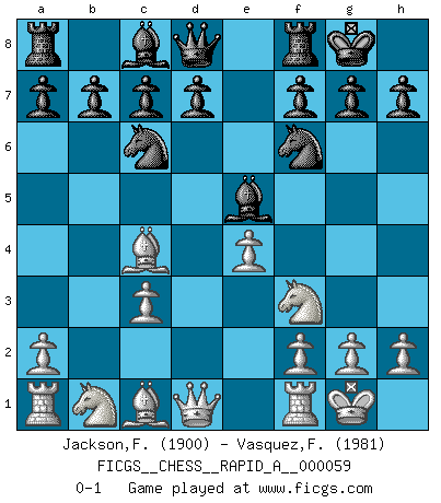 Last move : 0-1 2009 March 20 23:26:23 [Event "FICGS__CHESS__RAPID_A__000059"] [Site "FICGS"] [Date "2009.01.24"] [Round "1"] [White "Jackson,Freeman"] [Black "Vasquez,Fernando"] [Result "0-1"] [WhiteElo "1900"] [BlackElo "1981"] 1.e4 e5 2.Bc4 Bc5 3.b4 Bxb4 4.c3 Bd6 5.Nf3 Nf6 6.O-O O-O 7.d4 Nc6 8.dxe5 Bxe5 0-1 This chess game has been lost on time (started : 2009.01.24 15:41:42) Bishop's Opening : Wing gambit Kingside Castling by player White (move 6) Kingside Castling by player Black (move 6) Player Black won this chess game. Follow this game move after move (download)If your opponent offers you a draw, try to work out why he thinks he's worse off. (Nigel Short) Nach Morphy wurde nichts neues mehr in der Behandlung offener Positionen gefunden. (Mikhail Moiseyevich Botvinik) Aún el Rey más flojo huye despavorido ante la amenaza de un Jaque doble. (Aaron Nimzowitsch) Les échecs, c'est l'imagination. (David Bronstein) Computer Science is no more about computers than astronomy is about telescopes. (Edsger W. Dijkstra)
