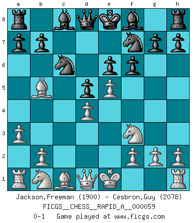 Last move : 0-1 2009 March 12 10:37:20 [Event "FICGS__CHESS__RAPID_A__000059"] [Site "FICGS"] [Date "2009.01.24"] [Round "1"] [White "Jackson,Freeman"] [Black "Cesbron,Guy"] [Result "0-1"] [WhiteElo "1900"] [BlackElo "2078"] 1.e4 e6 2.d4 d5 3.e5 c5 4.c3 Nc6 5.Nf3 cxd4 6.cxd4 Nh6 7.a3 f6 8.Bb5 Nf7 0-1 This chess game has been lost on time (started : 2009.01.24 15:41:42) French : Advance, Paulsen attack Player Black won this chess game. Follow this game move after move (download)When the Chess game is over, the Pawn and the King go back to the same box. (Irish saying) Frage: Wie viele Autos haben Sie schon zerstört? - Antwort: Nur zwei. (Loek van Wely) Muchos jugadores de Ajedrez se sorprendían cuando después de la partida, Fischer explicaba con calma: 'Yo ya había analizado esta posibilidad' en una posición en la cual yo creía que no era posible de prever desde la apertura. (Mikhail Tal) Ce n'est pas pour s'amuser qu'il joue aux échecs : il célèbre un culte. (Vladimir Nabokov) I believe in luck. How else can you explain the success of those you dislike ? (Jean Cocteau)