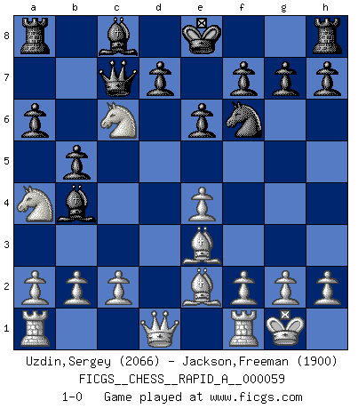Last move : 1-0 2009 March 12 10:37:20 [Event "FICGS__CHESS__RAPID_A__000059"] [Site "FICGS"] [Date "2009.01.24"] [Round "1"] [White "Uzdin,Sergey"] [Black "Jackson,Freeman"] [Result "1-0"] [WhiteElo "2066"] [BlackElo "1900"] 1.e4 c5 2.Nf3 e6 3.d4 cxd4 4.Nxd4 a6 5.Nc3 Qc7 6.Be2 Nf6 7.O-O Nc6 8.Be3 Bb4 9.Na4 b5 10.Nxc6 1-0 This chess game has been lost on time (started : 2009.01.24 15:41:42) Sicilian : Kan, 5.Nc3 Kingside Castling by player White (move 7) Player White won this chess game. Follow this game move after move (download)The way he plays Chess demonstrates a man's whole nature. (Stanley Ellin) Ich verachte die Medien. (Robert James Fischer) Una partida de Ajedrez se divide en 3 etapas: la primera cuando piensas que tienes la ventaja, la segunda cuando crees que tienes la ventaja y la tercera... ¡cuando te das cuenta que vas a perder!. (Savielly Tartakower) Le succès, c'est être capable d'aller d'échec en échec sans perdre son enthousiasme. (Winston Churchill) You know what they say : You lie down with the Devil, you wake up in Hell. (Horatio Caine, C.S.I. Miami)