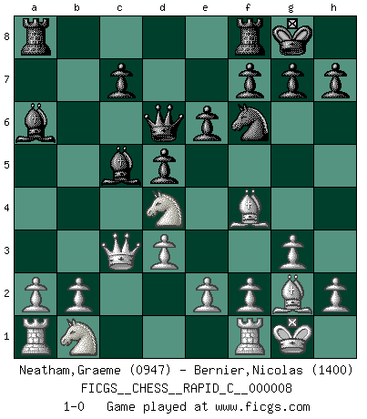 Last move : 1-0 2006 October 30 13:53:11 [Event "FICGS__CHESS__RAPID_C__000008"] [Site "FICGS"] [Date "2006.08.24"] [Round "1"] [White "Neatham,Graeme"] [Black "Bernier,Nicolas"] [Result "1-0"] [WhiteElo "0947"] [BlackElo "1400"] 1.Nf3 Nf6 2.g3 b5 3.Bg2 Bb7 4.O-O e6 5.d3 d5 6.c4 a6 7.Qb3 Nc6 8.Bd2 Bc5 9.cxb5 Nd4 10.Nxd4 O-O 11.bxa6 Bxa6 12.Qc3 Qd6 13.Bf4 1-0 This chess game has been lost on time (started : 2006.08.24 14:19:47) Reti : King's Indian attack, Spassky's variation Kingside Castling by player White (move 4) Kingside Castling by player Black (move 10) Player White won this chess game. Follow this game move after move (download)You must take your opponent into a deep dark forest where 2+2=5, and the path leading out is only wide enough for one. (Mikhail Tal) Viele Opfer benötigen überhaupt keine konkrete Berechnung. Es genügt sich die entstehende Position kurz vorzustellen, um uns davon zu überzeugen, dass das Opfer korrekt ist. (Mikhail Nekhemyevich Tal) El Ajedrez es un mar en el cual un mosquito puede beber y un elefante puede bañarse. (Refrán Hindú) À la honte des hommes, on sait que les lois du jeu sont les seules qui soient partout justes, claires, inviolables et exécutées. Pourquoi l'Indien qui a donné les règles du jeu d'échecs est-il obéi de bon gré dans toute la terre, et que les décrétales des papes, par exemple, sont aujourd'hui un objet d'horreur et de mépris ? C'est que l'inventeur des échecs combina tout avec justesse pour la satisfaction des joueurs, et que les papes, dans leurs décrétales, n'eurent en vue que leur seul avantage. L'Indien voulut exercer également l'esprit des hommes et leur donner du plaisir; les papes ont voulu abrutir l'esprit des hommes. Voltaire (Dictionnaire philosophique / Garnier 1967) Yoga is 99% practice and 1% knowledge. (Sri Krishna Pattabhi Jois)