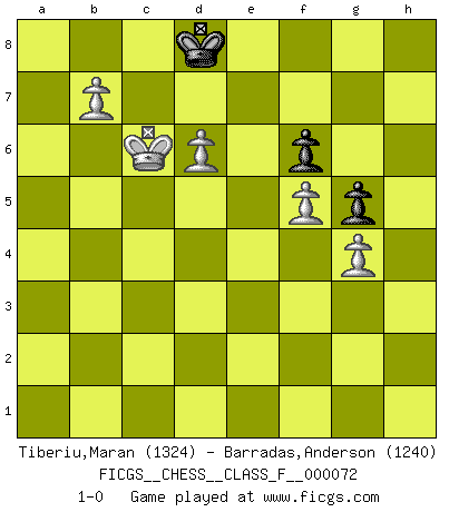 Last move : 1-0 2009 February 3 3:53:4 [Event "FICGS__CHESS__CLASS_F__000072"] [Site "FICGS"] [Date "2009.01.24"] [Round "1"] [White "Tiberiu,Maran"] [Black "Barradas,Anderson"] [Result "1-0"] [WhiteElo "1324"] [BlackElo "1240"] 1.e4 c5 2.Bc4 e6 3.d3 d5 4.exd5 exd5 5.Bb5+ Nc6 6.Bxc6+ bxc6 7.Nf3 Bg4 8.h3 Bh5 9.Nc3 Nf6 10.Bd2 Be7 11.Qe2 O-O 12.g4 Bg6 13.O-O-O Bd6 14.Bg5 h6 15.Bxf6 Qxf6 16.Rde1 Bf4+ 17.Kb1 c4 18.dxc4 dxc4 19.Qxc4 Rac8 20.Nd4 Bd2 21.Re2 Bxc3 22.Qxc3 c5 23.Nb5 Qxc3 24.Nxc3 a5 25.b3 Rfe8 26.Rxe8+ Rxe8 27.Rd1 Rc8 28.Nd5 Ra8 29.Ne7+ Kh7 30.Nxg6 Kxg6 31.Rd5 Rc8 32.f4 f6 33.h4 Kf7 34.Kb2 Ke6 35.c4 Rc7 36.Ka3 a4 37.Kxa4 Ra7+ 38.Kb5 Rxa2 39.Kxc5 Ra5+ 40.Kd4 Rxd5+ 41.cxd5+ Kd6 42.b4 g5 43.hxg5 hxg5 44.f5 Kd7 45.Kc5 Kc7 46.d6+ Kd7 47.b5 Kd8 48.Kc6 Kc8 49.b6 Kd8 50.b7 1-0 Sicilian defense Kingside Castling by player Black (move 11) Queenside Castling by player White (move 13) 10 pieces endgame at move 41 : White KPPPPP , Black KPPP WHITE : King + 5 Pawns BLACK : King + 3 Pawns 9 pieces endgame at move 43 : White KPPPPP , Black KPP WHITE : King + 5 Pawns BLACK : King + 2 Pawns 8 pieces endgame at move 43 : White KPPPP , Black KPP WHITE : King + 4 Pawns BLACK : King + 2 Pawns Player White won this chess game. Follow this game move after move (download)One bad move nullifies forty good ones. (Horowitz) Kein Schachspieler kann gut schlafen. (H. G. Wells) Cada Peón es una Reina en potencia. (James Mason) Toutes les manuvres exécutées sur une colonne ouverte ont pour but ultime l'intrusion définitive sur la septième ou la huitième rangée, en plein cur de la position ennemie. (Aaron Nimzovitch) The greatest con, that he ever pulled... was making you believe... that he is you. (Revolver, movie)