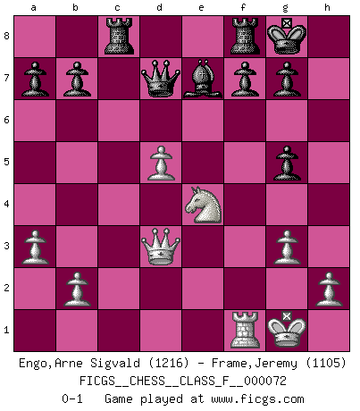 Last move : 0-1 2009 February 19 11:48:23 [Event "FICGS__CHESS__CLASS_F__000072"] [Site "FICGS"] [Date "2009.01.24"] [Round "1"] [White "Engo,Arne Sigvald"] [Black "Frame,Jeremy"] [Result "0-1"] [WhiteElo "1216"] [BlackElo "1105"] 1.c4 e5 2.Nc3 c6 3.g3 d5 4.cxd5 cxd5 5.d4 e4 6.Bg2 Nf6 7.Bg5 Be7 8.f3 exf3 9.Nxf3 Be6 10.O-O Nbd7 11.Qd2 O-O 12.Qd3 Rc8 13.Nd2 h6 14.a3 hxg5 15.e4 dxe4 16.Ndxe4 Nxe4 17.Bxe4 Nf6 18.d5 Bh3 19.Rae1 Bxf1 20.Rxf1 Nxe4 21.Nxe4 Qd7 0-1 English Opening Kingside Castling by player White (move 10) Kingside Castling by player Black (move 11) Player Black won this chess game. Follow this game move after move (download)After black's reply to 1.e4 with 1..e5, leaves him always trying to get into the game. (Howard Staunton) Jeder leidlich begabte Spieler, er braucht keineswegs hervorragend veranlagt zu sein, kann es zum Meister bringen. Aber das ist ja auch gar nicht nötig! Der richtige Standpunkt ist es, zu seinem Vergnügen zu spielen, und man glaube ja nicht, dass der Genuss proportional dem Können sei. (Siegbert Tarrasch) ¿Que sería del Ajedrez sin errores graciosos?. (Kurt Richter) A chaque perte on perd un peu de soi. (Joël Lautier) Computers have lots of memory but no imagination. (Anonymous)