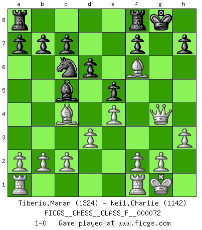 Last move : 1-0 2009 February 9 0:4:43 [Event "FICGS__CHESS__CLASS_F__000072"] [Site "FICGS"] [Date "2009.01.24"] [Round "1"] [White "Tiberiu,Maran"] [Black "Neil,Charlie"] [Result "1-0"] [WhiteElo "1324"] [BlackElo "1142"] 1.e4 e5 2.Bc4 Nc6 3.d3 Bc5 4.Nf3 d6 5.Nc3 Bg4 6.h3 Bxf3 7.Qxf3 Nf6 8.O-O Qe7 9.Nd5 Qd8 10.Bg5 O-O 11.Nxf6+ gxf6 12.Bxf6 Qd7 13.Qg3+ Qg4 14.Qxg4+ 1-0 Bishop's Opening Kingside Castling by player White (move 8) Kingside Castling by player Black (move 10) Player White won this chess game. Follow this game move after move (download)Adequate compensation for a sacrifice is having a sound combination leading to a winning position; adequate compensation for a blunder is having your opponent snatch defeat from the jaws of victory. (Bruce A. Moon) Die Arbeit ist etwas Unnatürliches. Die Faulheit allein ist göttlich. (Anatole France) Cada Peón es una Reina en potencia. (James Mason) Les pièces de l'échiquier étaient impitoyables. Elles le retenaient, elles l'absorbaient. Il y avait de l'horreur en cela, mais aussi une harmonie unique. Car, qu'y a-t-il dans le monde, à part les échecs ? (V. Nabokov) The ultimate in disposing one's troops is to be without ascertainable shape. Then the most penetrating spies cannot pry in nor can the wise lay plans against you. (Sun Tzu)