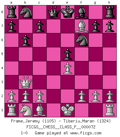 Last move : 1-0 2009 February 2 23:1:0 [Event "FICGS__CHESS__CLASS_F__000072"] [Site "FICGS"] [Date "2009.01.24"] [Round "1"] [White "Frame,Jeremy"] [Black "Tiberiu,Maran"] [Result "1-0"] [WhiteElo "1105"] [BlackElo "1324"] 1.e4 e5 2.Nf3 d6 3.d4 Bg4 4.dxe5 Bxf3 5.Qxf3 dxe5 6.Bc4 Nf6 7.Qb3 b6 8.Bxf7+ 1-0 Philidor's defense Player White won this chess game. Follow this game move after move (download)For surely of all the drugs in the world, Chess must be the most permanently pleasurable. (Assiac) Zu meiner Zeit war ein 20 jähriger ein junger Spieler, heute ist er ein Veteran. (Garry Kasparov) Muchos se han convertido en Maestros de Ajedrez, nadie se ha convertido en el Maestro del Ajedrez. (Siegbert Tarrasch) On peut tirer plus d'utilité d'une partie perdue que de 100 parties gagnées. (Capablanca) There are 10 types of people in this world: those who understand binary and those who don't. (Anonymous)