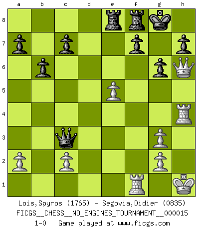 Last move : 1-0 2009 February 24 14:24:20 [Event "FICGS__CHESS__NO_ENGINES_TOURNAMENT__000015"] [Site "FICGS"] [Date "2009.01.26"] [Round "1"] [White "Lois,Spyros"] [Black "Segovia,Didier"] [Result "1-0"] [WhiteElo "1765"] [BlackElo "0835"] 1.e4 e5 2.Nf3 d6 3.d4 Bg4 4.dxe5 Bxf3 5.Qxf3 dxe5 6.Bc4 Nf6 7.Nc3 Bb4 8.O-O Bxc3 9.bxc3 O-O 10.Bg5 Qe7 11.Rab1 b6 12.Qf5 Nbd7 13.f4 Qc5+ 14.Kh1 Qxc4 15.Bxf6 Nxf6 16.fxe5 Nxe4 17.Rb4 Ng3+ 18.hxg3 Qxc3 19.Rh4 g6 20.Qg5 Rae8 21.Qh6 1-0 Philidor's defense Kingside Castling by player White (move 8) Kingside Castling by player Black (move 9) Player White won this chess game. Follow this game move after move (download)Blessed be the memory of him who gave the world this immortal game. (A. G. Gardiner) Der Schachmeister von Heute braucht Courage, einen Killerinstinkt, Ausdauer und Arroganz. (Larry Evans) Repentinamente, me resultaba obvio en mi analisis que yo había pasado por alto lo que Fischer había visto en el tablero con la mas grande facilidad. (Mikhail Botvinnik) Un journaliste : 'Vous préférez avoir une dame de plus sur l'échiquier ou au lit ?' Boris Spassky : 'Ca dépend de la position.' The modern world has divided itself into Conservatives and Progressives. The business of Progressives is to go on making mistakes. The business of the Conservatives is to prevent the mistakes from being corrected. (G.K. Chesterton)
