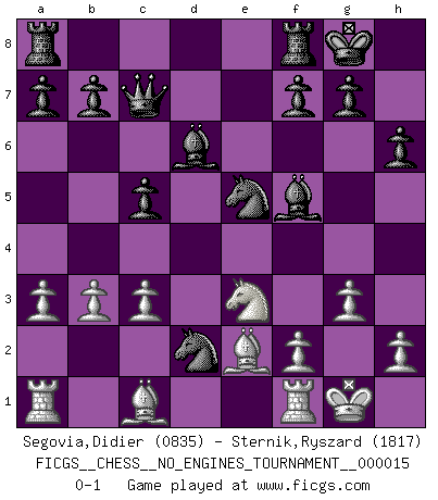 Last move : 0-1 2009 February 13 3:47:24 [Event "FICGS__CHESS__NO_ENGINES_TOURNAMENT__000015"] [Site "FICGS"] [Date "2009.01.26"] [Round "1"] [White "Segovia,Didier"] [Black "Sternik,Ryszard"] [Result "0-1"] [WhiteElo "0835"] [BlackElo "1817"] 1.e4 c5 2.c3 Qa5 3.Nf3 Nc6 4.Be2 Nf6 5.O-O Nxe4 6.Na3 d5 7.d3 Nf6 8.b3 e5 9.Qd2 Bd6 10.Nc2 O-O 11.a3 Qc7 12.g3 e4 13.dxe4 dxe4 14.Ng5 h6 15.Nxe4 Nxe4 16.Qd3 Bf5 17.Ne3 Ne5 18.Qd2 Nxd2 0-1 Sicilian : Alapin's variation (2.c3) Kingside Castling by player White (move 5) Kingside Castling by player Black (move 10) Player Black won this chess game. Follow this game move after move (download)Chess is above all, a fight ! (Emanuel Lasker) Schachspieler können ausgezeichnet Varianten am Schachbrett berechnen, aber nicht im realen Leben. Zu stark ist der Individualismus im Schach ausgeprägt, und für viele ist ein kleiner momentaner persönlicher Vorteil wichtiger als ein weit größerer Vorteil von morgen. (Anatoly Karpov) Alekhine es un poeta que crea un trabajo de arte de algo que raramente inspiraría a otra persona a mandar una tarjeta postal. (Max Euwe) Ce qui caractérise les parties de combat, c'est que si le défenseur a constamment de difficiles problèmes à résoudre, l'attaquant doit chercher sans relâche de nouvelles possibilités d'attaque. (Koblentz) I've lost money so fast in these clubs it's left me reeling. I've read every poker book ever written, but the only way to get better at the game is to go out and play with people who are really good. The problem is, you stand to lose a lot of money doing it. (Matt Damon)