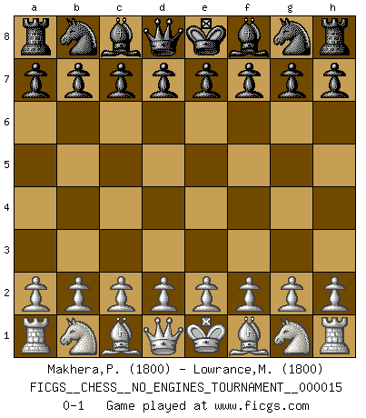Last move : 0-1 2009 March 7 22:20:37 [Event "FICGS__CHESS__NO_ENGINES_TOURNAMENT__000015"] [Site "FICGS"] [Date "2009.01.26"] [Round "1"] [White "Makhera,Percy"] [Black "Lowrance,Mackenzie"] [Result "0-1"] [WhiteElo "1800"] [BlackElo "1800"] 0-1 This chess game has been lost on time (started : 2009.01.26 16:13:25) Player Black won this chess game. Follow this game move after move (download)I'd rather have a Pawn than a finger. (Reuben Fine) Dieses schreckliche Gefühl, dass ich gegen eine Maschine spielte, die niemals Fehler macht, zerschmetterte meinen Widerstand. (Mark Taimanov) El Ajedrez es el gimnasio de la mente. (Blaise Pascal) On croit qu'il y a plus de mauvais joueurs que de bons joueurs, c'est faux : Il y a autant de joueurs qui gagnent que de joueurs qui perdent. (Philippe Geluck) If you know the enemy and know yourself you need not fear the results of a hundred battles. (Sun Tzu)