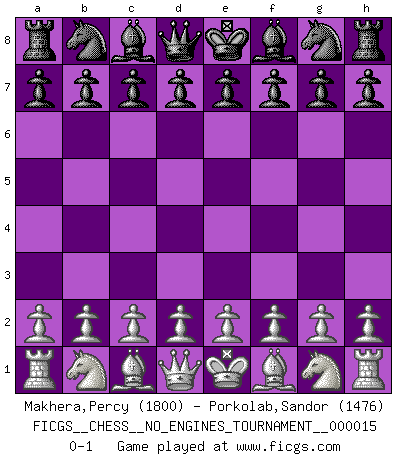 Last move : 0-1 2009 March 7 22:20:37 [Event "FICGS__CHESS__NO_ENGINES_TOURNAMENT__000015"] [Site "FICGS"] [Date "2009.01.26"] [Round "1"] [White "Makhera,Percy"] [Black "Porkolab,Sandor"] [Result "0-1"] [WhiteElo "1800"] [BlackElo "1476"] 0-1 This chess game has been lost on time (started : 2009.01.26 16:13:25) Player Black won this chess game. Follow this game move after move (download)If I win a tournament, I win it by myself. I do the playing. Nobody helps me. (Bobby Fischer) Schach ist mein Leben, meine Leidenschaft, was ich gelernt habe und seit meinem 14. Lebensjahr profimässig praktiziere. Darauf zu verzichten, würde mir sehr schwer fallen. (Viktor Kortschnoi) Cuando tu no sabes absolutamente que mas hacer, es tiempo de entrar en pánico. (John van der Wiel) Il vaut mieux sacrifier les pièces de l'adversaire. (Xavier Tartacover) To steal ideas from one person is plagiarism. To steal from many is research. (Unknown)