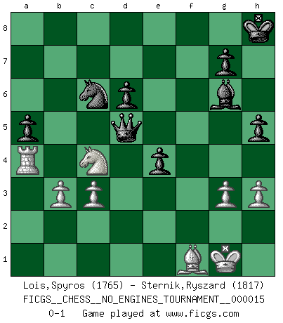 Last move : 0-1 2009 February 2 19:25:17 [Event "FICGS__CHESS__NO_ENGINES_TOURNAMENT__000015"] [Site "FICGS"] [Date "2009.01.26"] [Round "1"] [White "Lois,Spyros"] [Black "Sternik,Ryszard"] [Result "0-1"] [WhiteElo "1765"] [BlackElo "1817"] 1.e4 c5 2.Nf3 Nc6 3.d4 cxd4 4.Nxd4 Nf6 5.Nc3 e5 6.Ndb5 d6 7.Bg5 a6 8.Na3 b5 9.Nd5 Be7 10.Bxf6 Bxf6 11.c3 Bg5 12.Nc2 O-O 13.a4 bxa4 14.Rxa4 a5 15.Bc4 Rb8 16.b3 Kh8 17.O-O f5 18.exf5 Bxf5 19.Qe2 Bg6 20.Nce3 e4 21.Ng4 Qc8 22.h3 Qb7 23.Rd1 Bh4 24.g3 Bg5 25.Nde3 Qc7 26.Rd5 Bxe3 27.Qxe3 Ra8 28.Bf1 Rf3 29.Qd2 h5 30.Ne3 Raf8 31.Nc4 Rxf2 32.Qxf2 Rxf2 33.Kxf2 Qf7+ 34.Kg1 Qxd5 0-1 Sicilian : Pelikan (Lasker/Sveshnikov) variation Kingside Castling by player Black (move 12) Kingside Castling by player White (move 17) Player Black won this chess game. Follow this game move after move (download)All that matters on the Chessboard is good moves. (Bobby Fischer) Das Schach hält seine Meister in eigenen Banden, Fesseln; auf vielerlei Weise formt es ihren Geist, so dass die innere Freiheit selbst des Stärksten beeinflusst wird. (Albert Einstein) La caracteristica mas importante en la posición del Ajedrez es la actividad de las piezas. Esto es absolutamente fundamental en todas las fases del juego: Apertura, Juego Medio y especialmente Finales. La limitación primordial en la actividad de una pieza, es la estructuración de los Peones. (Michael Stean) Horreur, mais aussi harmonie suprême : qu'y avait-il en effet au monde en dehors des échecs ? Le brouillard, l'inconnu, le non-être... (Vladimir Nabokov) The real voyage of discovery consists not in seeking new lands but in seeing with new eyes. (Marcel Proust)