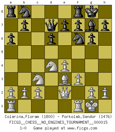 Last move : 1-0 2009 April 7 17:55:41 [Event "FICGS__CHESS__NO_ENGINES_TOURNAMENT__000015"] [Site "FICGS"] [Date "2009.01.26"] [Round "1"] [White "Colarina,Floram"] [Black "Porkolab,Sandor"] [Result "1-0"] [WhiteElo "1800"] [BlackElo "1476"] 1.e4 c5 2.Nf3 d6 3.d4 cxd4 4.Nxd4 Nf6 5.Bb5+ Bd7 6.Qe2 a6 7.Bxd7+ Qxd7 8.O-O g6 9.Nc3 Bg7 10.Be3 O-O 11.f3 1-0 Sicilian Kingside Castling by player White (move 8) Kingside Castling by player Black (move 10) Player White won this chess game. Follow this game move after move (download)Before the endgame, the Gods have placed the middle game. (Siegbert Tarrasch) Bobby Fischer ist kein Vorbild für die heutige Jugend. (Viktor Kortschnoi) Fischer no está bajo la obligación de nadie. (Joseph Platz) Tout change constamment, y compris dans le monde des Echecs. (Botvinnik) Thus, what is of supreme importance in war is to attack the enemy's strategy. (Sun Tzu)