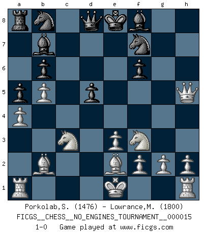 Last move : 1-0 2009 May 2 4:37:36 [Event "FICGS__CHESS__NO_ENGINES_TOURNAMENT__000015"] [Site "FICGS"] [Date "2009.01.26"] [Round "1"] [White "Porkolab,Sandor"] [Black "Lowrance,Mackenzie"] [Result "1-0"] [WhiteElo "1476"] [BlackElo "1800"] 1.b4 e5 2.Bb2 f6 3.b5 c6 4.a4 d5 5.e3 a6 6.c4 a5 7.Nc3 b6 8.cxd5 cxd5 9.d4 Bb7 10.Nf3 h5 11.Be2 g6 12.dxe5 Rh7 13.Qc2 Rc7 14.Qxg6+ Rf7 15.e6 Nh6 16.exf7+ Nxf7 17.Qxh5 1-0 This chess game has been lost on time (started : 2009.01.26 16:13:25) Polish (Sokolsky) opening Player White won this chess game. Follow this game move after move (download)Chess is really ninety nine percent calculation. (Soltis) Obwohl ich vom Stil her kaum zu den Priestern der Schachkunst gezählt werde, halte ich Schach doch für eine Kunst. (Tigran Petrosjan) Alekhine es un poeta que crea un trabajo de arte de algo que raramente inspiraría a otra persona a mandar una tarjeta postal. (Max Euwe) Il s'avisa de me proposer d'apprendre les échecs qu'il jouait un peu... me voilà forcené des échecs. J'achète un échiquier, je m'enferme dans ma chambre, j'y passe des jours et des nuits à vouloir apprendre par cur toutes les parties. (Jean-Jacques Rousseau, Confessions) Programming can only do so much before it becomes too much. (Don Groves)