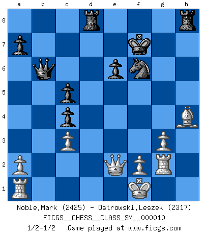 Last move : 1/2-1/2 2009 March 9 10:38:33 [Event "FICGS__CHESS__CLASS_SM__000010"] [Site "FICGS"] [Date "2009.01.26"] [Round "1"] [White "Noble,Mark"] [Black "Ostrowski,Leszek"] [Result "1/2-1/2"] [WhiteElo "2425"] [BlackElo "2317"] 1.d4 d5 2.c4 c6 3.Nf3 Nf6 4.Nc3 e6 5.Bg5 dxc4 6.e4 b5 7.e5 h6 8.Bh4 g5 9.Nxg5 hxg5 10.Bxg5 Nbd7 11.exf6 Bb7 12.g3 c5 13.d5 Nxf6 14.dxe6 Bg7 15.Rg1 Qb6 16.Qe2 Rd8 17.h4 fxe6 18.Bg2 O-O 19.h5 Bxg2 20.Rxg2 b4 21.h6 bxc3 22.hxg7 Kxg7 23.bxc3 Rh8 24.Bh4 Kf7 25.Kf1 1/2-1/2 QGD Slav : 4.Nc3 Kingside Castling by player Black (move 18) This chess game ended in a draw. Follow this game move after move (download)Some part of a mistake is always correct. (Savielly Tartakover) Schach ist Kampf, hauptsächlich jedoch gegen die eigenen Fehler. (Savielly Grigorievitsch Tartakower) Es el objetivo de la escuela moderna no tratar cada posición de acuerdo a una regla general, sino de acuerdo al principio inherente en la posición. (Richard Reti) C'est la seule position que je connaisse où les deux camps sont mals. Propos prêtés à V. Anand. The production of too many useful things results in too many useless people. (Karl Marx)