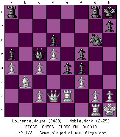 Last move : 1/2-1/2 2009 May 12 9:17:48 [Event "FICGS__CHESS__CLASS_SM__000010"] [Site "FICGS"] [Date "2009.01.26"] [Round "1"] [White "Lowrance,Wayne"] [Black "Noble,Mark"] [Result "1/2-1/2"] [WhiteElo "2439"] [BlackElo "2425"] 1.e4 c5 2.Nf3 Nc6 3.d4 cxd4 4.Nxd4 Nf6 5.Nc3 e5 6.Ndb5 d6 7.Bg5 a6 8.Na3 b5 9.Bxf6 gxf6 10.Nd5 f5 11.Bd3 Be6 12.O-O Bxd5 13.exd5 Ne7 14.Nxb5 Bg7 15.Nc3 e4 16.Bc4 O-O 17.Qd2 Ng6 18.Kh1 Qc7 19.Bb3 Bxc3 20.bxc3 f4 21.Rg1 f5 22.Rae1 Kh8 23.c4 a5 24.a4 Qc5 25.Re2 Rg8 26.f3 1/2-1/2 Sicilian : Pelikan (Lasker/Sveshnikov) variation Kingside Castling by player White (move 12) Kingside Castling by player Black (move 16) This chess game ended in a draw. Follow this game move after move (download)The Chess pieces are the block alphabet which shapes thoughts; and these thoughts, although making a visual design on the chessboard, express their beauty abstractly, like a poem. (Marcel Duchamp) Karpov ist ein Museumsstück. (Garry Kasparov) Las piezas de Ajedrez son los bloques del alfabeto que moldean los pensamientos; y esos pensamientos, aunque hagan un diseño visual en el tablero, expresan abstractamente su belleza como un poema. (Marcel Duchamp) Karpov est une pièce de musée. (Garry Kasparov) I believe in luck. How else can you explain the success of those you dislike ? (Jean Cocteau)