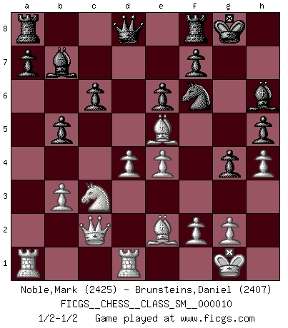 Last move : 1/2-1/2 2009 May 20 1:41:14 [Event "FICGS__CHESS__CLASS_SM__000010"] [Site "FICGS"] [Date "2009.01.26"] [Round "1"] [White "Noble,Mark"] [Black "Brunsteins,Daniel"] [Result "1/2-1/2"] [WhiteElo "2425"] [BlackElo "2407"] 1.d4 d5 2.c4 e6 3.Nf3 Nf6 4.Nc3 c6 5.Bg5 h6 6.Bh4 dxc4 7.e4 g5 8.Bg3 b5 9.Be2 Bb7 10.h4 g4 11.Ne5 h5 12.O-O Nbd7 13.Qc2 Nxe5 14.Bxe5 Bh6 15.b3 cxb3 16.axb3 O-O 17.Rfd1 1/2-1/2 Queen's gambit declined Kingside Castling by player White (move 12) Kingside Castling by player Black (move 16) This chess game ended in a draw. Follow this game move after move (download)There is no remorse like the remorse of Chess. (H. G. Wells) Es gibt nur zwei wahre Schachgenies - das andere war Wilhelm Steinitz, der Weltmeister von 1872 bis 1894. (Robert James Fischer) El juego del Ajedrez no es solamente una diversión quieta; algunas cualidades muy valuables de la mente se pueden adquirir y cultivar con el, como convertirlos en habitos disponibles para toda ocasión; ya que la vida es algo así como el Ajedrez. (Benjamin Franklin) Les échecs sont un jeu par leur forme, un art par leur essence et une science par sa difficulté d'acquisition. Ils peuvent vous procurer autant de plaisir qu'un bon livre ou une belle musique, mais vous n'aurez une réelle joie que si vous arrivez à bien jouer. (Tigran Petrosian) Art is not a thing, it is a way. (Elbert Hubbard)