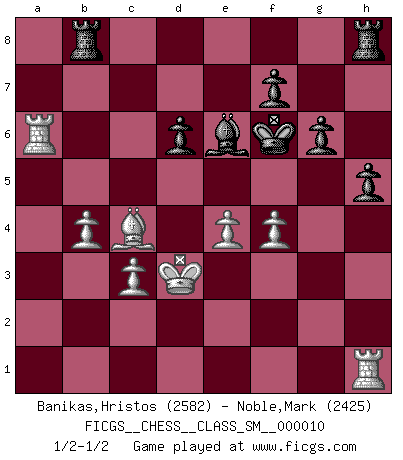 Last move : 1/2-1/2 2009 May 16 13:45:31 [Event "FICGS__CHESS__CLASS_SM__000010"] [Site "FICGS"] [Date "2009.01.26"] [Round "1"] [White "Banikas,Hristos"] [Black "Noble,Mark"] [Result "1/2-1/2"] [WhiteElo "2582"] [BlackElo "2425"] 1.e4 c5 2.Nf3 Nc6 3.d4 cxd4 4.Nxd4 Nf6 5.Nc3 e5 6.Ndb5 d6 7.Bg5 a6 8.Na3 b5 9.Nd5 Be7 10.Bxf6 Bxf6 11.c3 Bg5 12.Nc2 O-O 13.a4 bxa4 14.Rxa4 a5 15.Bc4 Rb8 16.b3 Kh8 17.Nce3 g6 18.h4 Bxh4 19.g3 Bg5 20.f4 exf4 21.gxf4 Bh4+ 22.Kd2 Ne7 23.Qg1 Nxd5 24.Nxd5 h5 25.Ra2 Kg7 26.Kd3 Bg4 27.Qd4+ Bf6 28.Nxf6 Qxf6 29.Qxf6+ Kxf6 30.Rxa5 Be6 31.b4 Rh8 32.Ra6 1/2-1/2 Sicilian : Pelikan (Lasker/Sveshnikov) variation Kingside Castling by player Black (move 12) This chess game ended in a draw. Follow this game move after move (download)It is difficult to play against Einstein's theory --on his first loss to Fischer. (Mikhail Tal) Die FIDE ist dabei in die Hände der russischen Mafia zu fallen. (Larry Evans) Los asuntos humanos son como una partida de Ajedrez: solo aquellos que no lo toman seriamente, pueden ser llamados buenos jugadores. (Hung Tzu Ch'eng) Ce qui caractérise les parties de combat, c'est que si le défenseur a constamment de difficiles problèmes à résoudre, l'attaquant doit chercher sans relâche de nouvelles possibilités d'attaque. (Koblentz) The arrogant army will lose certainly the battle. (Chinese proverb)