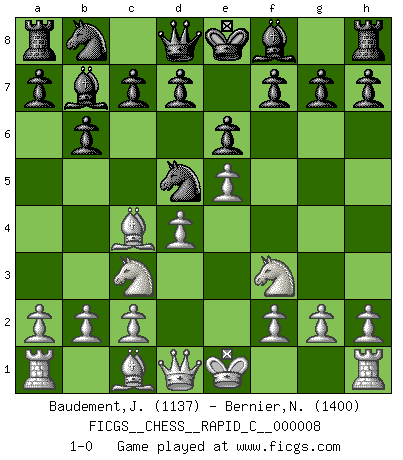 Last move : 1-0 2006 October 3 16:44:8 [Event "FICGS__CHESS__RAPID_C__000008"] [Site "FICGS"] [Date "2006.08.24"] [Round "1"] [White "Baudement,Julien"] [Black "Bernier,Nicolas"] [Result "1-0"] [WhiteElo "1137"] [BlackElo "1400"] 1.Nf3 b6 2.e4 Bb7 3.Nc3 Nf6 4.e5 Nd5 5.Bc4 e6 6.d4 1-0 This chess game has been lost on time (started : 2006.08.24 14:19:47) Reti Opening Player White won this chess game. Follow this game move after move (download)Fischer sacrificed virtually everything most of us weakies (to use his term) value, respect, and cherish, for the sake of an artful, often beautiful board game, for the ambivalent privilege of being its greatest master. (Paul Kollar) Es ist im Leben wie im Schachspiel. Wir entwerfen einen Plan, dieser bleibt jedoch bedingt durch das, was im Schachspiel dem Gegner, im Leben dem Schicksal zu tun belieben wird. (Arthur Schopenhauer) No volvere nunca a jugar contigo. Has insultado a mi amigo. - cuando un oponente se maldijo por una mala jugada (Miguel Najdorf) La vie est comme un jeu d'échecs : nous esquissons un plan, mais celui-ci est tributaire de ce que daignent faire l'adversaire aux échecs et le destin dans la vie. (Arthur Schopenhauer) Kids, you tried your best and you failed miserably. The lesson is, never try. (Simpsons)