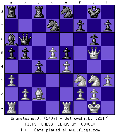 Last move : 1-0 2009 August 18 8:55:42 [Event "FICGS__CHESS__CLASS_SM__000010"] [Site "FICGS"] [Date "2009.01.26"] [Round "1"] [White "Brunsteins,Daniel"] [Black "Ostrowski,Leszek"] [Result "1-0"] [WhiteElo "2407"] [BlackElo "2317"] 1.d4 d5 2.Nf3 Nf6 3.c4 e6 4.Nc3 c6 5.e3 Nbd7 6.Bd3 dxc4 7.Bxc4 b5 8.Bd3 a6 9.e4 c5 10.d5 c4 11.Bc2 e5 12.O-O Bd6 13.Ne2 O-O 14.Ng3 a5 15.Bg5 Re8 16.h3 g6 17.Qd2 Ba6 18.a3 Qb6 19.Rfe1 Bc5 20.Be3 Bxe3 21.Rxe3 Rec8 22.R3e1 Ne8 23.Qg5 1-0 Queen's pawn game Kingside Castling by player White (move 12) Kingside Castling by player Black (move 13) Player White won this chess game. Follow this game move after move (download)I like the moment when I break a man's ego. (Bobby Fischer) Fallen sollten polizeilich verboten werden. (Savielly Grigorievitsch Tartakower) El Ajedrez, como cualquier otra actividad creativa, puede existir solo a través de méritos combinados de aquellos que tienen talento creativo y de aquellos que tienen la habilidad de organizar un trabajo creativo. (Mikhail Botvinnik) On croit qu'il y a plus de mauvais joueurs que de bons joueurs, c'est faux : Il y a autant de joueurs qui gagnent que de joueurs qui perdent. (Philippe Geluck) Nothing is more important for teaching us to understand the concepts we have than constructing fictitious ones. (Ludwig Wittgenstein)