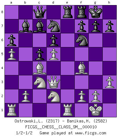 Last move : 1/2-1/2 2009 March 18 4:56:37 [Event "FICGS__CHESS__CLASS_SM__000010"] [Site "FICGS"] [Date "2009.01.26"] [Round "1"] [White "Ostrowski,Leszek"] [Black "Banikas,Hristos"] [Result "1/2-1/2"] [WhiteElo "2317"] [BlackElo "2582"] 1.d4 Nf6 2.c4 c5 3.d5 b5 4.cxb5 a6 5.b6 e6 6.Nc3 Bb7 7.e4 exd5 8.exd5 d6 9.a4 Qxb6 10.Nf3 Be7 11.a5 Qc7 12.Bc4 O-O 13.O-O Nbd7 14.Re1 Rae8 15.Qd3 Qc8 16.h3 Bd8 17.Bf4 Bc7 18.Nd2 1/2-1/2 Benko gambit half accepted Kingside Castling by player Black (move 12) Kingside Castling by player White (move 13) This chess game ended in a draw. Follow this game move after move (download)All I want to do, ever, is just play Chess. (Bobby Fischer) Ein typischer, sehr verbreiteter Gedankenschädling ist der, daß der betreffende Amateur von der Annanhme ausgeht, daß jeder einzelne Zug etwas zu leisten habe. (Aaron Nimzowitsch) El Ajedrez no es una pizca de inferior al violín, y tenemos un gran número de violinistas profesionales. (Mikhail Botvinnik) J'ai vu le vaincu d'Echecs jouer des années durant dans l'espoir de la fête de la victoire. Car tu es plus riche de ce qu'elle existe si même elle n'est point pour toi. Ainsi de la perle du fond des mers. (Antoine de Saint-Exupéry) Mandala - that's it! 16x16 squares as multiple of the four and the eight because of the Four Noble Truths and the Noble Eightfold Path. (Heinz-Georg Lehnhoff about Big Chess)