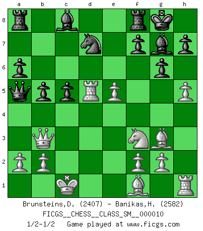 Last move : 1/2-1/2 2009 May 11 20:47:57 [Event "FICGS__CHESS__CLASS_SM__000010"] [Site "FICGS"] [Date "2009.01.26"] [Round "1"] [White "Brunsteins,Daniel"] [Black "Banikas,Hristos"] [Result "1/2-1/2"] [WhiteElo "2407"] [BlackElo "2582"] 1.d4 Nf6 2.Nf3 g6 3.c4 Bg7 4.Nc3 d5 5.Qb3 dxc4 6.Qxc4 O-O 7.e4 a6 8.Qb3 Nc6 9.e5 Nd7 10.Bf4 e6 11.O-O-O Ne7 12.h4 c5 13.d5 Nxd5 14.Nxd5 exd5 15.Rxd5 Qc7 16.Bg3 Qa5 17.h5 b5 1/2-1/2 King's Indian : East Indian defense Kingside Castling by player Black (move 6) Queenside Castling by player White (move 11) This chess game ended in a draw. Follow this game move after move (download)What is the difference between chess and football? Everybody understands football, but nobody plays it. Everybody plays chess, but nobody understands it. Everything is relative. (Vladimir Kramnik) Der Vorposten provoziert a) eine Basis für neue Angriffe und b) eine Schwächung der gegnerischen Widerstandskraft in der fraglichen Linie. (Aaron Nimzowitsch) Cuando estes solo, cuando te sientas un extraño en el mundo, juega al Ajedrez. Esto levantará tu espiritu y será tu consejero de guerra. (Aristóteles) Avant la finale, les dieux ont créé le milieu de partie. (Tarrasch) Now be brave and don't look back. Don't look back. (Shmi Skywalker in Star Wars ep.1)