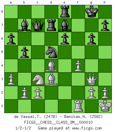 Last move : 1/2-1/2 2009 May 1 20:40:3 [Event "FICGS__CHESS__CLASS_SM__000010"] [Site "FICGS"] [Date "2009.01.26"] [Round "1"] [White "de Vassal,Thibault"] [Black "Banikas,Hristos"] [Result "1/2-1/2"] [WhiteElo "2478"] [BlackElo "2582"] 1.e4 c5 2.Nc3 e6 3.Nf3 Nc6 4.d4 cxd4 5.Nxd4 a6 6.Be2 Qc7 7.Be3 Nf6 8.a3 Be7 9.f4 d6 10.O-O O-O 11.Qe1 Nxd4 12.Bxd4 b5 13.Qg3 Bb7 14.Rae1 Rad8 15.Kh1 Rd7 16.Bd3 Re8 17.Re3 g6 18.Re2 d5 19.exd5 Nxd5 20.Rxe6 fxe6 1/2-1/2 Sicilian : Closed Kingside Castling by player White (move 10) Kingside Castling by player Black (move 10) This chess game ended in a draw. Follow this game move after move (download)Kasparov : J'adoube , Ivanchuk : S'il vous plaît ! (Garry Kasparov & Vassily Ivanchuk, Linares 1997) Die meiste Zeit treffe ich auf Gegner, die meine Enkel sein könnten. Ich bin da, um ihnen zu zeigen, dass sie von mir noch einiges lernen können. (Viktor Kortschnoi) Vive, pierde y aprende al observar a tu oponente como ganar. (Amber Steenbock) D'abord les bases : Jouez et étudiez, puis étudiez et jouez, ensuite jouez et étudiez, puis étudiez et jouez. Deuxièmement : Donnez toujours le meilleur de vous-même ! (Ken Smith) Computer Science is no more about computers than astronomy is about telescopes. (Edsger W. Dijkstra)