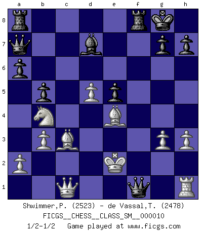 Last move : 1/2-1/2 2009 April 19 19:21:3 [Event "FICGS__CHESS__CLASS_SM__000010"] [Site "FICGS"] [Date "2009.01.26"] [Round "1"] [White "Shwimmer,Peter"] [Black "de Vassal,Thibault"] [Result "1/2-1/2"] [WhiteElo "2523"] [BlackElo "2478"] 1.Nf3 c5 2.c4 Nf6 3.d4 cxd4 4.Nxd4 e5 5.Nb5 d5 6.cxd5 Bc5 7.N1c3 O-O 8.g3 a6 9.Na3 Qb6 10.e3 Qc7 11.Bd2 Nbd7 12.Bg2 b5 13.Rc1 Qa7 14.Nc2 Nb6 15.Ne4 Nxe4 16.Bxe4 f5 17.Bg2 Nc4 18.Bc3 f4 19.b3 Nxe3 20.fxe3 Bxe3 21.Be4 f3 22.h3 Bxc1 23.Qxc1 f2+ 24.Ke2 Bd7 25.Nb4 f1Q+ 1/2-1/2 Reti Opening Kingside Castling by player Black (move 7) Promotion Queen by player Black (move 25) This chess game ended in a draw. Follow this game move after move (download)Fischer is the strongest player in the world. In fact, the strongest player who ever lived. (Larry Evans) Sie führen leise Selbstgespräche, schlürfen lautstark ihre Getränke, schmatzen hörbar beim Essen, blasen ihrem Gegenüber Rauch in die Augen, niesen ihm ins Gesicht, starren ihn unverwandt an, bis er sich unter ihren Blicken windet, rutschen ständig auf ihrem Stuhl hin und her, rülpsen und bohren in der Nase. (Anonymous) Botvinnik trató de alejar el misterio referente al Ajedrez, siempre relacionandolo a situaciones de la vida diaria. Solía llamar al Ajedrez un problema inexacto típico, similar a aquellos en que la gente tiene siempre que resolver a cada día. (Garry Kasparov) Les Echecs sont et restent toujours un combat, un combat intégral comme la boxe, la lutte ou un autre sport, et où il doit y avoir un vainqueur et un vaincu. (Joseph Emil Diemer) Pushing plastic is for the many, pushing virtual pieces is for the fewer, pushing wood is for the very few. (Normajean Yates)
