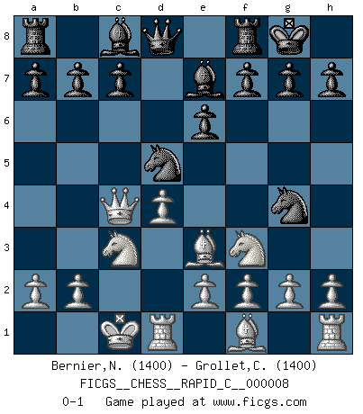 Last move : 0-1 2006 October 4 16:49:55 [Event "FICGS__CHESS__RAPID_C__000008"] [Site "FICGS"] [Date "2006.08.24"] [Round "1"] [White "Bernier,Nicolas"] [Black "Grollet,Christian"] [Result "0-1"] [WhiteElo "1400"] [BlackElo "1400"] 1.Nf3 Nf6 2.d4 d5 3.c4 e6 4.Bg5 Be7 5.Nc3 O-O 6.Qc2 Nc6 7.O-O-O Nb4 8.Qb3 Ng4 9.Be3 dxc4 10.Qxc4 Nd5 0-1 This chess game has been lost on time (started : 2006.08.24 14:19:47) Reti Opening Kingside Castling by player Black (move 5) Queenside Castling by player White (move 7) Player Black won this chess game. Follow this game move after move (download)Adequate compensation for a sacrifice is having a sound combination leading to a winning position; adequate compensation for a blunder is having your opponent snatch defeat from the jaws of victory. (Bruce A. Moon) Kasparov stellt für gewöhnlich die Regeln auf und bricht sie dann selbst wieder. (Alexej Shirov) Prefiero perder una partida realmente buena, que ganar una mala. (David Levy) A ce moment-là, je menaçais de comprendre la position ! (Clément L'Heureux) Plans are ideas that never come to fruition. (Daniel Parmet)