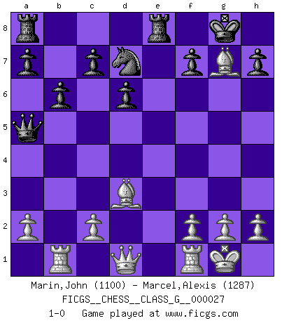 Last move : 1-0 2009 January 31 7:51:27 [Event "FICGS__CHESS__CLASS_G__000027"] [Site "FICGS"] [Date "2009.01.28"] [Round "1"] [White "Marin,John"] [Black "Marcel,Alexis"] [Result "1-0"] [WhiteElo "1100"] [BlackElo "1287"] 1.e4 e5 2.Nf3 Nf6 3.Nxe5 d6 4.Nc4 Nxe4 5.Nc3 Nxc3 6.bxc3 Be7 7.d4 O-O 8.Bd3 Be6 9.Ne3 Nd7 10.d5 Bxd5 11.Nxd5 Re8 12.Nxe7+ Qxe7+ 13.Be3 Qe5 14.O-O Qxc3 15.Rb1 b6 16.Bd4 Qa5 17.Bxg7 1-0 Petrov : Paulsen attack Kingside Castling by player Black (move 7) Kingside Castling by player White (move 14) Player White won this chess game. Follow this game move after move (download)The hallmark of the artist is simplicity. (Larry Evans) Bis zum Jahr 1971 verlief in meiner Schachkariere alles glatt. Dieses dramatische Match [Fischer-Taimanov 6:0] machte mein Leben zur Hölle. (Mark Taimanov) No hay otro maestro que tenga una voluntad terrífica de ganar. Al tablero, el irradía peligro y aún los oponentes mas fuertes tienden a congelarse como liebres cuando olfatean a una pantera. Aún sus debilidades son peligrosas. Con las blancas, su juego de apertura es predecible - te es posible hacer planes en su contra - pero es tan fuerte que tus planes casi nunca funcionan. En el juego medio, su precisión e invención son fabulosas y en finales, tú simplemente no le puedes vencer. (Experto Alemán anónimo) Je menace de comprendre la position. (Anonyme) Excelling at chess has long been considered a symbol of more general intelligence. That is an incorrect assumption in my view, as pleasant as it might be. But for the purposes of argument and investigation, chess is, in Russkin-Gutman's words, 'an unparalleled laboratory, since both the learning process and the degree of ability obtained can be objectified and quantified, providing an excellent comparative framework on which to use rigorous analytical techniques.' (The Chess Master and the Computer, by Garry Kasparov - 2010)