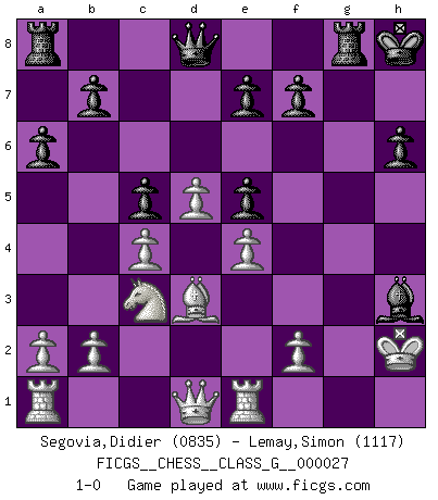 Last move : 1-0 2009 May 14 5:51:15 [Event "FICGS__CHESS__CLASS_G__000027"] [Site "FICGS"] [Date "2009.01.28"] [Round "1"] [White "Segovia,Didier"] [Black "Lemay,Simon"] [Result "1-0"] [WhiteElo "0835"] [BlackElo "1117"] 1.e4 g6 2.d4 Bg7 3.Nf3 d6 4.Bd3 Nf6 5.Bg5 O-O 6.O-O Nbd7 7.c4 c5 8.d5 h6 9.Bh4 g5 10.Bg3 a6 11.h3 Nh5 12.Bh2 Kh8 13.Nxg5 Ne5 14.Bxe5 Bxe5 15.Nc3 Nf4 16.Nf3 Nxh3+ 17.gxh3 Bxh3 18.Nxe5 dxe5 19.Re1 Rg8+ 20.Kh2 1-0 This chess game has been lost on time (started : 2009.01.28 10:13:21) Robatsch (Modern) defense Kingside Castling by player Black (move 5) Kingside Castling by player White (move 6) Player White won this chess game. Follow this game move after move (download)Fischer prefers to enter Chess history alone. (Miguel Najdorf) Wer sich die Fähigkeit anerziehen will im Schach selbstständig zu denken, der muß alles meiden, was leblos ist: ausgeklügelte Theorien, die sich auf sehr wenige Beispiele und eine Menge Hirngespinste stützen. (Emanuel Lasker) Bobby es la celebridad menos entendida y malinterpretada que camina el la faz de esta tierra. (Yasser Seirawan) Aucun coup ne doit être joué sans but. (Pedro Damiano) Those parts of the system that you can hit with a hammer (not advised) are called hardware; those program instructions that you can only curse at are called software. (Anonymous)