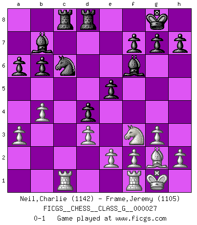 Last move : 0-1 2009 February 12 22:19:13 [Event "FICGS__CHESS__CLASS_G__000027"] [Site "FICGS"] [Date "2009.01.28"] [Round "1"] [White "Neil,Charlie"] [Black "Frame,Jeremy"] [Result "0-1"] [WhiteElo "1142"] [BlackElo "1105"] 1.c4 e5 2.g3 c6 3.Bg2 d5 4.cxd5 cxd5 5.Nf3 Nc6 6.O-O Bd6 7.d3 Nf6 8.Qb3 O-O 9.Bg5 d4 10.Nbd2 b6 11.Ne4 Be7 12.Rac1 Bb7 13.Qb5 a6 14.Qb3 Na5 15.Nxf6+ Bxf6 16.Qc2 Bxg5 17.Qc7 Bf6 18.Qxd8 Rfxd8 19.b4 Nc6 20.a3 Rac8 0-1 English Opening Kingside Castling by player White (move 6) Kingside Castling by player Black (move 8) Player Black won this chess game. Follow this game move after move (download)When in doubt... play Chess ! (Tevis) Ein Schachspiel besteht aus drei Phasen: Die erste, wenn du hofftst den Vorteil zu haben, die zweite, wenn du glaubst einen Vorteil zu haben, und die dritte.... wenn du weißt Du wirst verlieren. (Savielly Grigorievitsch Tartakower) El jugador táctico sabe que hacer cuando hay algo que hacer; mientras que el estratega sabe que hacer cuando no hay nada que hacer. (Gerald Abrahams) Les Echecs sont et restent toujours un combat, un combat intégral comme la boxe, la lutte ou un autre sport, et où il doit y avoir un vainqueur et un vaincu. (Joseph Emil Diemer) Begin at the beginning and go on till you come to the end; then stop. (Lewis Carrol, Alice in Wonderland)