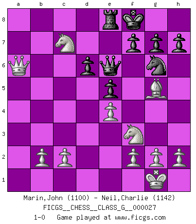 Last move : 1-0 2009 February 6 15:58:37 [Event "FICGS__CHESS__CLASS_G__000027"] [Site "FICGS"] [Date "2009.01.28"] [Round "1"] [White "Marin,John"] [Black "Neil,Charlie"] [Result "1-0"] [WhiteElo "1100"] [BlackElo "1142"] 1.e4 e5 2.Nf3 Nc6 3.Bb5 a6 4.Ba4 b5 5.Bb3 d6 6.a4 bxa4 7.Bxa4 Nge7 8.d4 Bd7 9.dxe5 dxe5 10.O-O Ng6 11.Qd5 Bd6 12.Bxc6 Bxc6 13.Qxc6+ Kf8 14.Rxa6 Rxa6 15.Qxa6 Ke7 16.Nc3 Re8 17.Rd1 Kf8 18.Nb5 Qf6 19.Bg5 Qe6 20.Rxd6 cxd6 21.Nc7 1-0 Ruy Lopez : Caro variation Kingside Castling by player White (move 10) Player White won this chess game. Follow this game move after move (download)Examine moves that smite! A good eye for smites is far more important than a knowledge of strategical principles. (Purdy) Ich bin es gewohnt, das die Jugend mir überhaupt keinen Respekt entgegenbringt. (Alexander Morozewich) Si tu oponente te ofrece un empate, trata de averiguar porque piensa él que esta en una posición peor. (Nigel Short) Les échecs, c'est l'art d'analyser. (Mikhail Botvinnik) They say in chess you've got to kill the queen, and then you mate it... Oh I, do you ? (Red Hot Chili Peppers, Fortune faded)