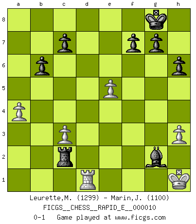 Last move : 0-1 2009 February 3 21:52:1 [Event "FICGS__CHESS__RAPID_E__000010"] [Site "FICGS"] [Date "2009.01.28"] [Round "1"] [White "Leurette,Marc-Antoine"] [Black "Marin,John"] [Result "0-1"] [WhiteElo "1299"] [BlackElo "1100"] 1.e4 e5 2.Nf3 Nc6 3.d4 exd4 4.Nxd4 Bc5 5.Be3 Qf6 6.c3 Nge7 7.Bc4 Ne5 8.Be2 Qg6 9.O-O d6 10.f3 O-O 11.Nd2 d5 12.Kh1 Bb6 13.Nc2 dxe4 14.Bxb6 axb6 15.fxe4 Rd8 16.Nd4 N7c6 17.Nxc6 bxc6 18.Qc2 Qg5 19.Nf3 Nxf3 20.Bxf3 Rd2 21.Qc1 Be6 22.Rf2 Rad8 23.e5 h6 24.Rxd2 Rxd2 25.Bxc6 Bg4 26.Be4 Qe3 27.Qe1 Re2 28.Qb1 Qxe4 29.Qxe4 Rxe4 30.h3 Be6 31.Rd1 Re2 32.Rb1 Bd5 33.Rg1 Rxb2 34.a4 Rc2 35.Rd1 Bxg2+ 0-1 Scotch game Kingside Castling by player White (move 9) Kingside Castling by player Black (move 10) Player Black won this chess game. Follow this game move after move (download)Pawns are born free, yet they are everywhere in chains. (Rick Kennedy) Jeder Schachmeister war einmal ein Anfänger. (Irving Chernev) Una de estas pequeñas movidas modestas pudieran ser mas molestas a tu oponente que la amenaza mas grande. (Siegbert Tarrasch) L'action d'une oeuvre littéraire se déroule sur un champ de bataille. Les masques et les types du drame moderne correspondent aux pièces du jeu d'échecs. L'intrigue correspond aux coups et aux gambits, c'est à dire aux techniques du jeu telles qu'utilisées et interprétées par les joueurs. Les tactiques et les péripéties [mouvements] correspondent aux coups exécutés par l'adversaire. (Viktor Shklovsky) All maxims have their antagonist maxims; proverbs should be sold in pairs, a single one being but a half truth. (William Mathews)