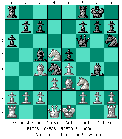 Last move : 1-0 2009 February 2 22:46:39 [Event "FICGS__CHESS__RAPID_E__000010"] [Site "FICGS"] [Date "2009.01.28"] [Round "1"] [White "Frame,Jeremy"] [Black "Neil,Charlie"] [Result "1-0"] [WhiteElo "1105"] [BlackElo "1142"] 1.e4 e5 2.Bc4 Nc6 3.Nf3 Bc5 4.d3 a6 5.Ng5 Nh6 6.Qf3 O-O 7.Nc3 Nd4 8.Qd1 Qf6 9.Nf3 d5 10.Be3 Bg4 11.Nxd5 1-0 Bishop's Opening Kingside Castling by player Black (move 6) Player White won this chess game. Follow this game move after move (download)I won't play with you anymore. You have insulted my friend. - When an opponent cursed himself for a blunder. (Miguel Najdorf) Ja, ich habe einmal eine Blitzpartie gespielt, es war in einem Zug, 1929. --im Interview 1989 (Mikhail Moiseyevich Botvinik) Yo no creo en la psicología. Yo creo en las buenas movidas. (Bobby Fischer) Que feriez-vous si vous étiez en train de jouer aux échecs et que la fin du monde arrive ? Je continuerais à jouer. (Saint Borromée) 98% of all statistics are made up. (Author unknown)