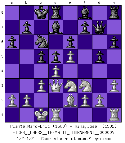 Last move : 1/2-1/2 2006 November 11 12:14:52 [Event "FICGS__CHESS__THEMATIC_TOURNAMENT__000009"] [Site "FICGS"] [Date "2006.08.27"] [Round "1"] [White "Plante,Marc-Eric"] [Black "Riha,Josef"] [Result "1/2-1/2"] [WhiteElo "1600"] [BlackElo "1592"] 1.d4 Nf6 2.Bg5 e6 3.e4 h6 4.Bxf6 Qxf6 5.Nf3 d6 6.Nc3 g5 7.h3 a6 8.e5 Qg7 9.Qd3 d5 10.Nd1 c5 11.c3 Nc6 12.Be2 Bd7 13.Ne3 O-O-O 14.O-O-O 1/2-1/2 Trompowsky attack (Ruth, Opovcensky Opening) Queenside Castling by player Black (move 13) Queenside Castling by player White (move 14) This chess game ended in a draw. Follow this game move after move (download)Modern Chess is too much concerned with things like Pawn structure. Forget it, Checkmate ends the game. (Nigel Short) Ein Kibitz ist einer, der deinem Gegner gute Ratschläge gibt. (Andrew Soltis) Antes de los Finales, los dioses han colocado el Juego Medio. (Siegbert Tarrasch) Seul un grand joueur sait à quel point il joue faiblement. (Xavier Tartacover) Two beer, or not two beer. (Unknown)