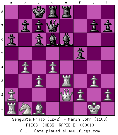 Last move : 0-1 2009 March 23 16:11:0 [Event "FICGS__CHESS__RAPID_E__000010"] [Site "FICGS"] [Date "2009.01.28"] [Round "1"] [White "Sengupta,Arnab"] [Black "Marin,John"] [Result "0-1"] [WhiteElo "1242"] [BlackElo "1100"] 1.e4 e5 2.Nf3 Nc6 3.Bb5 a6 4.Ba4 Nf6 5.O-O Be7 6.c3 Nxe4 7.Re1 Nc5 8.Bxc6 dxc6 9.Nxe5 Nd3 10.Nxd3 Qxd3 11.Re3 Qd5 12.d4 Be6 13.Qe2 O-O-O 14.b4 Rhe8 15.Re5 Qd7 16.g3 Bd6 17.Re3 f5 0-1 Ruy Lopez : Closed defense Kingside Castling by player White (move 5) Queenside Castling by player Black (move 13) Player Black won this chess game. Follow this game move after move (download)Chess is as much a mystery as women. (Purdy) Kein Großmeister ist normal. Sie unterscheiden sich nur im Ausmaß Ihrer Verrücktheit. (Viktor Kortschnoi) La táctica fluye a partir de una posición superior. (Bobby Fischer) À la honte des hommes, on sait que les lois du jeu sont les seules qui soient partout justes, claires, inviolables et exécutées. Pourquoi l'Indien qui a donné les règles du jeu d'échecs est-il obéi de bon gré dans toute la terre, et que les décrétales des papes, par exemple, sont aujourd'hui un objet d'horreur et de mépris ? C'est que l'inventeur des échecs combina tout avec justesse pour la satisfaction des joueurs, et que les papes, dans leurs décrétales, n'eurent en vue que leur seul avantage. L'Indien voulut exercer également l'esprit des hommes et leur donner du plaisir; les papes ont voulu abrutir l'esprit des hommes. Voltaire (Dictionnaire philosophique / Garnier 1967) If only people were all showed a certain minimum level of niceness; if only people didn't retract verbal draw offers (without draw box ticked) on ficgs; if only people didn't kill; if only people didn't run concentration / extermination camps, if only people didn't drop nuclear bombs on Hiroshima and Nagasaki, and so on - it would be a much more beautiful world. But sadly, things are not so... (Normajean Yates)