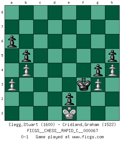 Last move : 0-1 2009 February 15 7:50:49 [Event "FICGS__CHESS__RAPID_C__000067"] [Site "FICGS"] [Date "2009.01.29"] [Round "1"] [White "Clegg,Stuart"] [Black "Cridland,Graham"] [Result "0-1"] [WhiteElo "1600"] [BlackElo "1522"] 1.e4 c5 2.d4 cxd4 3.c3 dxc3 4.Nxc3 Nc6 5.Nf3 e6 6.Bc4 a6 7.O-O b5 8.Bd3 Bb7 9.Bg5 Be7 10.Bxe7 Ngxe7 11.Rc1 d6 12.Qe2 Qb6 13.Rfd1 Rd8 14.Bc2 Ng6 15.Bb3 O-O 16.a3 Rfe8 17.Ba2 Nge5 18.Nxe5 dxe5 19.Qg4 Rxd1+ 20.Rxd1 Rd8 21.Bb1 Rxd1+ 22.Qxd1 Nd4 23.Ne2 g6 24.Nxd4 Qxd4 25.Qxd4 exd4 26.e5 Kg7 27.Kf1 f6 28.f4 fxe5 29.fxe5 Bd5 30.Kf2 Kh6 31.g3 Kg5 32.Ke2 Bc4+ 33.Kf3 d3 34.Ke3 Kf5 35.Bxd3+ Bxd3 36.Kxd3 Kxe5 37.Ke3 g5 38.h4 g4 39.b3 h5 40.b4 Kf5 41.Kd4 e5+ 42.Ke3 Kf6 43.Ke4 Ke6 44.Ke3 Kd5 45.Kd3 e4+ 46.Ke3 Ke5 47.Ke2 Kd4 48.Kd2 e3+ 49.Ke2 Ke4 50.Kd1 Kf3 51.Ke1 e2 0-1 Sicilian : Smith-Morra gambit Kingside Castling by player White (move 7) Kingside Castling by player Black (move 15) Player Black won this chess game. Follow this game move after move (download)Chess is so inspiring that I do not believe a good player is capable of having an evil thought during the game. (Wilhelm Steinitz) Ein Teil des Fehlers ist immer korrekt. (Savielly Grigorievitsch Tartakower) Dejen al perfeccionista jugar por correo. (Yasser Seirawan) La victoire dans une partie d'Echecs appartient la plupart du temps à celui qui voit un peu plus loin que l'adversaire. (Lasker) Crush them ! Make them suffer ! (General Grievous in Star Wars ep.3)