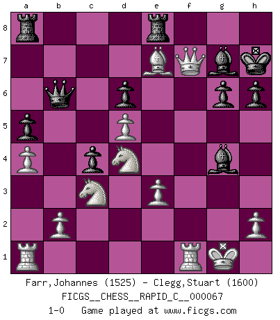 Last move : 1-0 2009 February 5 23:18:5 [Event "FICGS__CHESS__RAPID_C__000067"] [Site "FICGS"] [Date "2009.01.29"] [Round "1"] [White "Farr,Johannes"] [Black "Clegg,Stuart"] [Result "1-0"] [WhiteElo "1525"] [BlackElo "1600"] 1.d4 Nf6 2.c4 g6 3.Nc3 Bg7 4.Nf3 O-O 5.Bg5 d6 6.e3 c5 7.d5 Nbd7 8.Qc2 h6 9.Bh4 Qa5 10.Nd2 a6 11.Bd3 b5 12.Nb3 Qb6 13.O-O bxc4 14.Bxc4 Ne5 15.Be2 a5 16.a4 Bg4 17.f3 Bh5 18.g4 c4 19.Nd4 Nexg4 20.fxg4 Nxg4 21.Bxg4 Bxg4 22.Qf2 Rfe8 23.Qxf7+ Kh7 24.Bxe7 1-0 King's Indian defense, 3.Nc3 Kingside Castling by player Black (move 4) Kingside Castling by player White (move 13) Player White won this chess game. Follow this game move after move (download)Chess is a matter of delicate judgment, knowing when to punch and how to duck. (Bobby Fischer) Es war undenkbar für die Behörden, dass ein sowjetischer Großmeister auf diese Art und Weise [Fischer-Taimanov 6:0] verliert, ohne dass es eine politischer Erklärung dafür gäbe. (Mark Taimanov) Me gusta decir que Bobby Fischer fue el mejor jugador que jamás haya existido. Pero lo que hizo de Fischer un genio, fue su habilidad de mezclar una frescura y pragmatismo Americano con ideas Rusas acerca de la estrategia. (Bruce Pandolfini) Avec des compensations pour le matériel en plus... (Anonyme) Life doesn't imitate art, it imitates bad television. (Woody Allen)