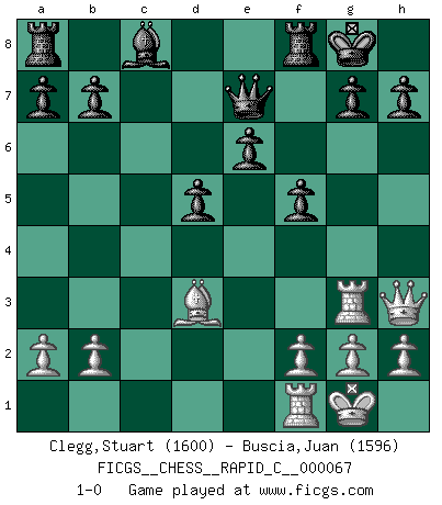 Last move : 1-0 2009 March 25 11:59:45 [Event "FICGS__CHESS__RAPID_C__000067"] [Site "FICGS"] [Date "2009.01.29"] [Round "1"] [White "Clegg,Stuart"] [Black "Buscia,Juan"] [Result "1-0"] [WhiteElo "1600"] [BlackElo "1596"] 1.e4 c5 2.d4 cxd4 3.c3 dxc3 4.Nxc3 Nc6 5.Bc4 e6 6.Nf3 Bb4 7.Bd2 Nf6 8.O-O O-O 9.Rc1 Bxc3 10.Bxc3 Nxe4 11.Nd4 Nxc3 12.Rxc3 Nxd4 13.Qxd4 d5 14.Rg3 f6 15.Qg4 Qe7 16.Bd3 f5 17.Qh3 1-0 This chess game has been lost on time (started : 2009.01.29 13:21:16) Sicilian : Smith-Morra gambit Kingside Castling by player White (move 8) Kingside Castling by player Black (move 8) Player White won this chess game. Follow this game move after move (download)When I asked Fischer why he had not played a certain move in our game, he replied: 'Well, you laughed when I wrote it down !' (Mikhail Tal) Im Leben werden Partien nie so unstrittig gewonnen wie im Spiel (Emanuel Lasker) Te sientas frente a un tablero y repentinamente tu corazón brinca. Tu mano tiembla al tomar una pieza y moverla. Pero lo que el Ajedrez te enseña es que tu debes permanecer ahí con calma y pensar de que si realmente es una buena idea o de que si hay otras ideas mejores. (Stanley Kubrick) Aucun coup ne doit être joué sans but. (Pedro Damiano) Whenever people agree with me, I always feel I must be wrong. (Oscar Wilde)