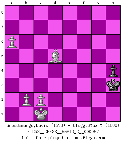 Last move : 1-0 2009 February 8 3:40:42 [Event "FICGS__CHESS__RAPID_C__000067"] [Site "FICGS"] [Date "2009.01.29"] [Round "1"] [White "Grosdemange,David"] [Black "Clegg,Stuart"] [Result "1-0"] [WhiteElo "1693"] [BlackElo "1600"] 1.e4 e5 2.Nf3 Nc6 3.Bc4 Nf6 4.Ng5 d5 5.exd5 Na5 6.Bb5+ c6 7.dxc6 bxc6 8.Be2 h6 9.Nf3 e4 10.Ne5 Bd6 11.f4 exf3 12.Nxf3 O-O 13.d4 c5 14.dxc5 Bxc5 15.Qxd8 Rxd8 16.Bd2 Nc6 17.Nc3 Ng4 18.Rf1 Bf5 19.O-O-O Rab8 20.Bc4 Nb4 21.Bb3 Bd6 22.h3 Nf6 23.Nd4 Bd7 24.Bxh6 gxh6 25.Rxf6 Be5 26.Rxf7 Bxh3 27.gxh3 Bxd4 28.Rxd4 Rxd4 29.Rb7 Kh8 30.Rxb8+ Kg7 31.Rb7+ Kg6 32.Rxa7 Kg5 33.Ra4 Rh4 34.Nd5 Nxd5 35.Rxh4 Kxh4 36.Bxd5 Kxh3 37.a4 h5 38.a5 h4 39.a6 1-0 Two knights defense Kingside Castling by player Black (move 12) Queenside Castling by player White (move 19) 10 pieces endgame at move 35 : White KRBPPPP , Black KNP WHITE : King + 1 Rook 1 Bishop 4 Pawns BLACK : King + 1 Knight 1 Pawn 9 pieces endgame at move 35 : White KBPPPP , Black KNP WHITE : King + 1 Bishop 4 Pawns BLACK : King + 1 Knight 1 Pawn 8 pieces endgame at move 36 : White KBPPPP , Black KP WHITE : King + 1 Bishop 4 Pawns BLACK : King + 1 Pawn 7 pieces endgame at move 36 : White KBPPP , Black KP WHITE : King + 1 Bishop 3 Pawns BLACK : King + 1 Pawn Player White won this chess game. Follow this game move after move (download)Before the endgame, the Gods have placed the middle game. (Siegbert Tarrasch) Ich brauche nur einen Blick auf das Schachbrett zu werfen, und weiß schon, was in der Stellung steckt, was geschehen kann und was geschehen wird. Alle übrigen suchen und prüfen, ich aber weiß es! (José Raúl Capablanca) Yo adoro todas la posiciones. Denme una partida posicional difícil, y la jugaré. Pero posiciones totalmente ganadas, no las tolero. (Hein Donner) Le jeu d'échecs est comme rejeté hors du temps. (Antoine de Saint-Exupéry) Creativity is allowing yourself to make mistakes. Art is knowing which ones to keep. (Scott Adams)