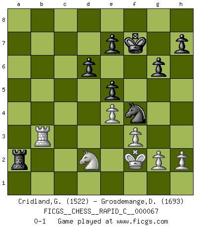 Last move : 0-1 2009 February 13 0:4:26 [Event "FICGS__CHESS__RAPID_C__000067"] [Site "FICGS"] [Date "2009.01.29"] [Round "1"] [White "Cridland,Graham"] [Black "Grosdemange,David"] [Result "0-1"] [WhiteElo "1522"] [BlackElo "1693"] 1.e4 c5 2.Nf3 Nc6 3.d4 cxd4 4.Nxd4 g6 5.Nc3 Bg7 6.Be3 Nf6 7.Bc4 O-O 8.Bb3 Na5 9.O-O Nxb3 10.Nxb3 d6 11.f3 Be6 12.Qd2 Bc4 13.Rfd1 Qc7 14.Qf2 a6 15.Bb6 Qc8 16.Na5 Be6 17.Rab1 Nd7 18.Bd4 Qc7 19.Bxg7 Kxg7 20.Nb3 b5 21.Nd4 Qc5 22.Nxe6+ fxe6 23.a4 Rfc8 24.Rd2 Nb6 25.Qxc5 Rxc5 26.axb5 axb5 27.Ne2 Nc4 28.Rd3 b4 29.c3 b3 30.Nd4 Kf7 31.Nxb3 Rb5 32.Rd4 Rc8 33.Nd2 Rxb2 34.Rxb2 Nxb2 35.Nb1 Ra8 36.Kf2 Ra1 37.Nd2 e5 38.Rd5 Nd1+ 39.Kg3 Nxc3 40.Rd3 Ne2+ 41.Kf2 Nf4 42.Rb3 Ra2 0-1 Sicilian : Accelerated Fianchetto, Modern variation with Bc4 Kingside Castling by player Black (move 7) Kingside Castling by player White (move 9) Player Black won this chess game. Follow this game move after move (download)A man without frontiers. He didn't divide the East and the West, he brought them together in their admiration for him. (Ljubomir Ljubojevic, about Bobby Fischer's death) Mein Gehirn das ist mein zweitwichtigstes Organ [Aus dem Film: Der Schläfer]. (Woody Allen) Preferería tener un Peón que un dedo. (Reuben Fine) Toutes les manuvres exécutées sur une colonne ouverte ont pour but ultime l'intrusion définitive sur la septième ou la huitième rangée, en plein cur de la position ennemie. (Aaron Nimzovitch) You can't play chess if you're groggy from pills. (Anatoly Karpov)