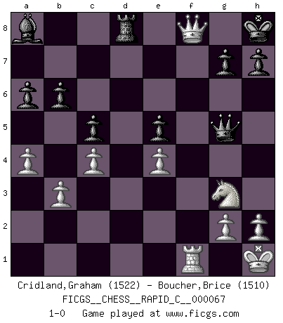 Last move : 1-0 2009 March 26 18:38:34 [Event "FICGS__CHESS__RAPID_C__000067"] [Site "FICGS"] [Date "2009.01.29"] [Round "1"] [White "Cridland,Graham"] [Black "Boucher,Brice"] [Result "1-0"] [WhiteElo "1522"] [BlackElo "1510"] 1.e4 c5 2.Nf3 e6 3.d4 cxd4 4.Nxd4 a6 5.Bd3 Qc7 6.c4 Nf6 7.O-O Be7 8.Nc3 d6 9.Be3 O-O 10.f3 Nc6 11.Rb1 Ne5 12.Qe2 b6 13.Rfc1 Bb7 14.b3 Nxd3 15.Qxd3 Nd7 16.Qe2 Nf6 17.Kh1 Rac8 18.Na4 Nd7 19.Nc3 Nc5 20.a4 Nd7 21.Qf2 Ba8 22.Qg3 Bf6 23.Nde2 Be5 24.f4 Bf6 25.Rd1 Nc5 26.Qf3 Rfd8 27.f5 Qb7 28.Bxc5 dxc5 29.fxe6 fxe6 30.Ng3 Qc7 31.Nce2 Be5 32.Qg4 Qe7 33.Nf4 Bxf4 34.Qxf4 Qf6 35.Rxd8+ Rxd8 36.Qc7 e5 37.Rf1 Qg5 38.Qf7+ Kh8 39.Qf8+ 1-0 Sicilian : Kan, 5.Bd3 Kingside Castling by player White (move 7) Kingside Castling by player Black (move 9) Player White won this chess game. Follow this game move after move (download)You need not play well - just help your opponent to play badly. (Genrikh Chepukaitis) Ich glaube, ich kenne inzwischen die Gründe für mein Versagen: schachliche Charakterfehler. Ich war nie ein Wunderkind und in meiner gesamten menschlichen Entwicklung immer zu langsam. (Viktor Kortschnoi) El Ajedrez es de 30 a 40 por ciento psicología. Uno no cuenta con esto cuando se juega contra una computadora. No lo puedo confundir. (Judith Polgar) Donnez-moi un Cavalier en 6e et je gagnerais toutes mes parties. (Steinitz) A generalist learns less and less about more and more until he knows nothing about everything. (Author unknown)
