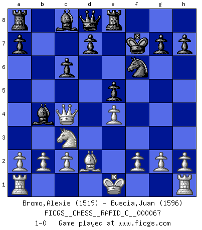 Last move : 1-0 2009 March 19 23:5:31 [Event "FICGS__CHESS__RAPID_C__000067"] [Site "FICGS"] [Date "2009.01.29"] [Round "1"] [White "Bromo,Alexis"] [Black "Buscia,Juan"] [Result "1-0"] [WhiteElo "1519"] [BlackElo "1596"] 1.e4 c5 2.Nf3 Nc6 3.d4 cxd4 4.Nxd4 Nf6 5.Nc3 e5 6.Nxc6 bxc6 7.Bc4 Bb4 8.Bd2 O-O 9.Qe2 Re8 10.Bxf7+ Kxf7 11.Qc4+ 1-0 Sicilian : Pelikan (Lasker/Sveshnikov) variation Kingside Castling by player Black (move 8) Player White won this chess game. Follow this game move after move (download)Chess is war over the board. The object is to crush the opponents mind. (Bobby Fischer) Wer mein Gambit spielt, muß bereit sein, alle Brücken hinter sich abzubrechen. Es verändert den ganzen Menschen. Es wirkt wie ein Zauberstab und fördert verkümmerte, gute Charakter- eigenschaften wieder zu Tage. (Emil Joseph Diemer) Yo siempre he tenido un ligero sentimiento de lástima por una persona que no tiene conocimiento del Ajedrez. (Siegbert Tarrasch) Je crois qu'il existe des manières très spécifiques de jouer efficacement contre une machine. Evidemment, nous n'avons aucune chance en technique pure, parce que l'ordinateur calcule de manière parfaite. Mais lorsque nous faisons appel à notre cerveau, en utilisant l'intuition et la compréhension, alors nous restons beaucoup plus forts. (Anatoli Karpov) Inventor: A person who makes an ingenious arrangement of wheels, levers and springs, and believes it civilization. (Ambrose Bierce, The Devil's Dictionary)