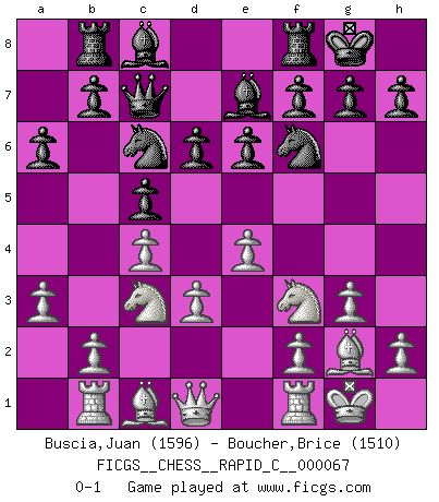 Last move : 0-1 2009 March 25 11:59:45 [Event "FICGS__CHESS__RAPID_C__000067"] [Site "FICGS"] [Date "2009.01.29"] [Round "1"] [White "Buscia,Juan"] [Black "Boucher,Brice"] [Result "0-1"] [WhiteElo "1596"] [BlackElo "1510"] 1.c4 c5 2.Nc3 e6 3.Nf3 a6 4.e4 Qc7 5.d3 Be7 6.g3 d6 7.Bg2 Nf6 8.O-O O-O 9.a3 Nc6 10.Rb1 Rb8 0-1 This chess game has been lost on time (started : 2009.01.29 13:21:16) English : Symmetrical variation Kingside Castling by player White (move 8) Kingside Castling by player Black (move 8) Player Black won this chess game. Follow this game move after move (download)During a Chess competition a Chessmaster should be a combination of a beast of prey and a monk. (Alexander Alekhine) Es ist nicht das erste mal, dass sich die FIDE dem Arabischen Geld gebeugt hat (über die FIDE WM 2004 in Lybien). (Larry Evans) Las ideas audaces son como las piezas del Ajedrez que avanzan hacia adelante. Ellas pueden ser vencidas, pero también pueden iniciar una partida victoriosa. (Goethe) Les Echecs ne sont pas pour les âmes timides. Ils requièrent un homme entier, qui ne s'arrête pas aveuglément à ce qui a été déjà établi, mais qui tente individuellement de sonder les profondeurs du jeu. (W. Steinitz) I couldn't make any sense out of what this particular thread is about. It sounds like R2 D2 computer speaking. A space fight ?!? Some 'command' problems in Moscow ? Some killers & narcotic addicts attacking some game & a god wannabe ?? (Dinesh De Silva, lost in a russian conflict in FICGS forum)