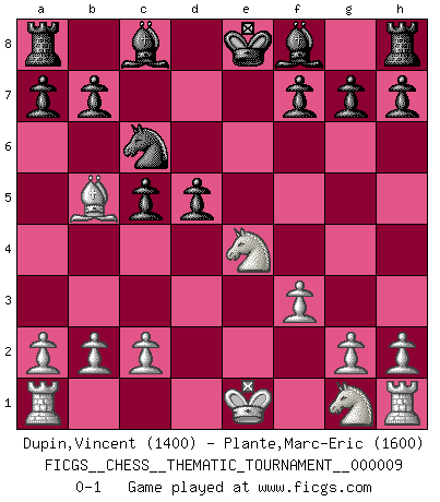 Last move : 0-1 2006 December 10 16:36:22 [Event "FICGS__CHESS__THEMATIC_TOURNAMENT__000009"] [Site "FICGS"] [Date "2006.08.27"] [Round "1"] [White "Dupin,Vincent"] [Black "Plante,Marc-Eric"] [Result "0-1"] [WhiteElo "1400"] [BlackElo "1600"] 1.d4 Nf6 2.Bg5 Ne4 3.Bf4 c5 4.d5 Qb6 5.Bc1 e6 6.f3 Qa5+ 7.Bd2 Nxd2 8.Qxd2 Qxd2+ 9.Nxd2 exd5 10.e4 dxe4 11.Nxe4 d5 12.Bb5+ Nc6 0-1 Trompowsky attack (Ruth, Opovcensky Opening) Player Black won this chess game. Follow this game move after move (download)If a ruler does not understand Chess, how can he rule over a kingdom ? (King Khusros II) Der vorletzte Fehler gewinnt. (Savielly Grigorievitsch Tartakower) El Ajedrez es el juego mas altamente simbólico, pero las agresiones estan por lo tanto aún mas francamente representadas en la partida. Tal vez comenzo como un juego de guerra; Algo como la representación de una batalla en miniatura entre las fuerzas de dos reinos. (Karl Meninger) Il vaut toujours mieux jouer un plan faux de façon logique que de n'avoir pas de plan du tout. (Victor Kortchnoï) Humor is by far the most significant activity of the human brain. (Edward De Bono)