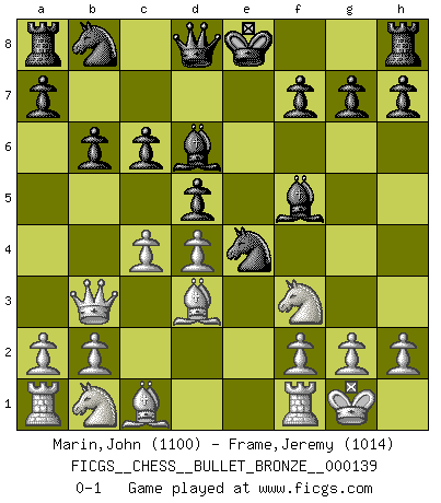 Last move : 0-1 2009 January 30 2:15:21 [Event "FICGS__CHESS__BULLET_BRONZE__000139"] [Site "FICGS"] [Date "2009.01.30"] [Round "1"] [White "Marin,John"] [Black "Frame,Jeremy"] [Result "0-1"] [WhiteElo "1100"] [BlackElo "1014"] 1.e4 e5 2.Nf3 Nf6 3.Nxe5 d6 4.Nf3 Nxe4 5.d4 d5 6.Bd3 Bf5 7.O-O Bd6 8.c4 c6 9.Qb3 b6 0-1 This chess game has been lost on time (started : 2009.01.30 2:0:21) Petrov : Classical attack Kingside Castling by player White (move 7) Player Black won this chess game. Follow this game move after move (download)The blunders are all there on the board, waiting to be made. (Savielly Tartakover) Die unerbitterlichsten Regeln im Schach sind die Ausnahmen. (Savielly Grigorievitsch Tartakower) Preferería tener un Peón que un dedo. (Reuben Fine) Tout change constamment, y compris dans le monde des Echecs. (Botvinnik) The weakness of an artist is dogma. (Josh Waitzkin)