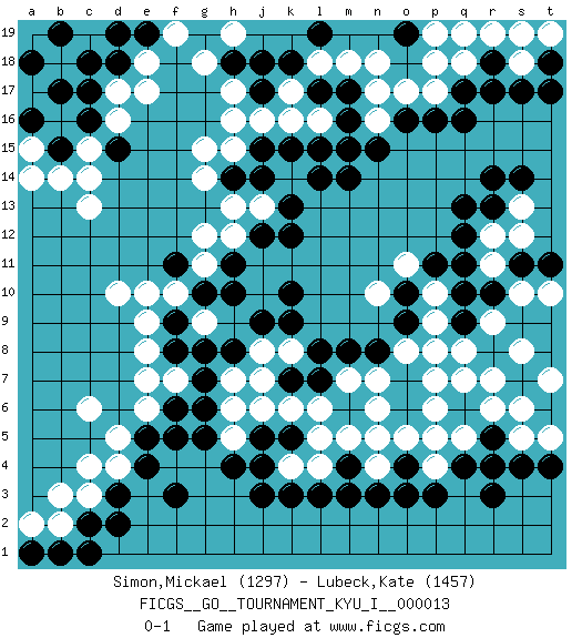 Last move : 0-1 2009 May 9 0:17:7 [Event "FICGS__GO__TOURNAMENT_KYU_I__000013"] [Site "FICGS"] [Date "2009.01.30"] [Round "1"] [Black "Simon,Mickael"] [White "Lubeck,Kate"] [Result "0-1"] [Rating 1 "1297"] [Rating 2 "1457"] 1.q16 d4 2.q4 d16 3.q10 d10 4.f3 c6 5.d2 c3 6.j3 o17 7.r14 q18 8.r17 k16 9.k10 c13 10.c17 d17 11.c16 c15 12.b15 b14 13.d15 c14 14.d18 e18 15.c18 e17 16.o3 h12 17.c2 b2 18.d3 c4 19.e4 e6 20.f5 g9 21.r3 r7 22.r10 p7 23.o9 s5 24.s4 q5 25.p5 p6 26.r5 r6 27.q6 t5 28.t4 t7 29.f6 e7 30.f8 e9 31.f9 f10 32.g10 g11 33.h10 s8 34.f11 e10 35.h11 g12 36.j12 j13 37.k12 s6 38.k13 k14 39.j14 h13 40.h14 g14 41.k15 h15 42.j15 j16 43.l15 g15 44.m17 l16 45.m16 m15 46.l14 n18 47.o16 m18 48.l17 l18 49.j17 k17 50.n15 n16 51.m14 n17 52.m15 q8 53.r18 p17 54.p16 n6 55.m8 m5 56.m3 k6 57.h8 f7 58.g7 e8 59.g8 s10 60.s11 t10 61.t11 r9 62.q9 o8 63.n8 n7 64.b1 a2 65.k18 h16 66.h18 h17 67.j18 g18 68.q19 p19 69.q17 r19 70.s19 q19 71.o19 p18 72.l19 h19 73.a16 h5 74.j5 j6 75.k5 l5 76.h4 h7 77.e5 d5 78.l7 l6 79.g6 h6 80.k3 o5 81.o4 l4 82.l3 k4 83.j4 n4 84.e19 f19 85.d19 m7 86.l8 s18 87.s17 t19 88.t17 a17 89.a18 a14 90.b17 a15 91.b19 q7 92.c1 j8 93.k7 j7 94.a1 b3 95.j9 k8 96.k9 p9 97.o10 p10 98.p11 r11 99.q11 r12 100.t18 s19 101.q12 s13 102.r13 s12 103.s14 p8 104.m4 q5 105.r4 p4 106.p3 p5 107.n3 n5 108.g5 o11 109.q13 n10 0-1 Here are the names of the openings (joseki) played in the four corners : Corner d4 : d4 f3 Hoshi (Hwajeom, Seongjeom, Xingwei`) 4-4 Point. The star or hoshi (4-4) point, emphasizing influence at the potential expense of territory. Ikken Kakari (Hankan Keolch'im, Yi Gua`jiao~, 1-Space Low Approach). Black 2 is the standard approach move to the 4-4. Corner q16 : q16 o17 Hoshi (Hwajeom, Seongjeom, Xingwei`) 4-4 Point. The star or hoshi (4-4) point, emphasizing influence at the potential expense of territory. Ikken Kakari (Hankan Keolch'im, Yi Gua`jiao~, 1-Space Low Approach). White 2 is the standard approach move to the 4-4. Player White won this Go (weiqi, baduk) game. Follow this game move after move (download)Balance is not what players strike for, and if it does arise, it is in spite of them. (Pierre Audouard) If only faces could talk... (Pat Summerall, Sportscaster during the Super Bowl)